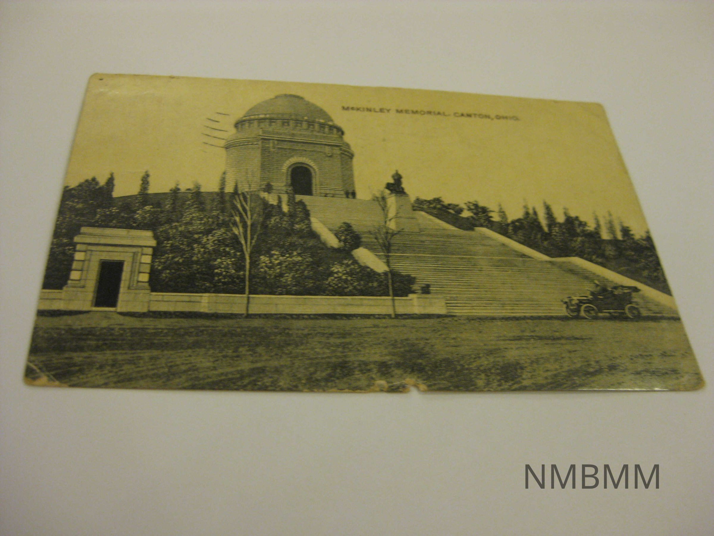 This item is a horizontal black and whitepostcard with an image of the McKinley National Memorial in Canton, Ohio. There is a car parked in front of the steps. There are people standing on the steps and in front of the tomb. Split back: green one cent Benjamin Franklin stamp. Postmark Canal Dover Jul 5 6-30P 1911 Ohio. Printed in Germany. Addressed to Mrs. Joseph Meese Wilmot Ohio, the sender's mother. Signed by Nellie. Ink stamp of American flag.Collection