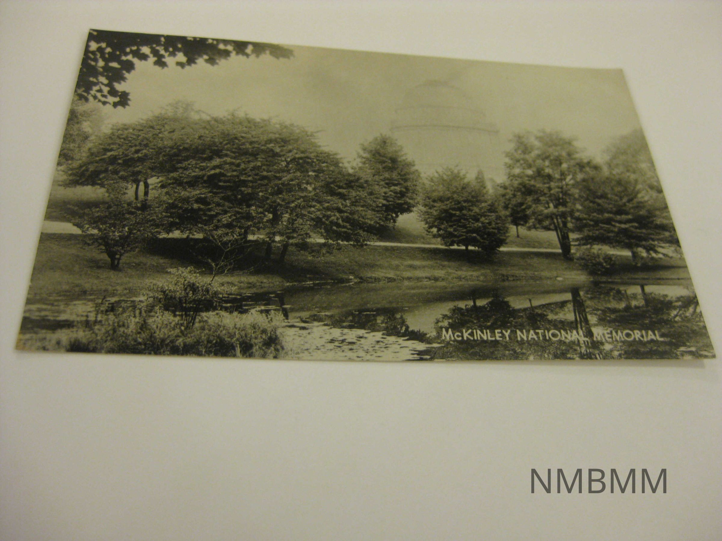 This item is a horizontal black and white postcard with an image of the McKinley Memorial in Canton, Ohio. There are a lot of trees in the image. Split Back side: Text, "This Memorial to William McKinley, 25th President of the United States, was erected by contributions from more than a million men, women, and children in the United States and foreign lands. The McKinley National Memorial, Canton, is administered by the Ohio State Archaelogical and Historical Society, Columbus." Made in U.S.A.Collection
