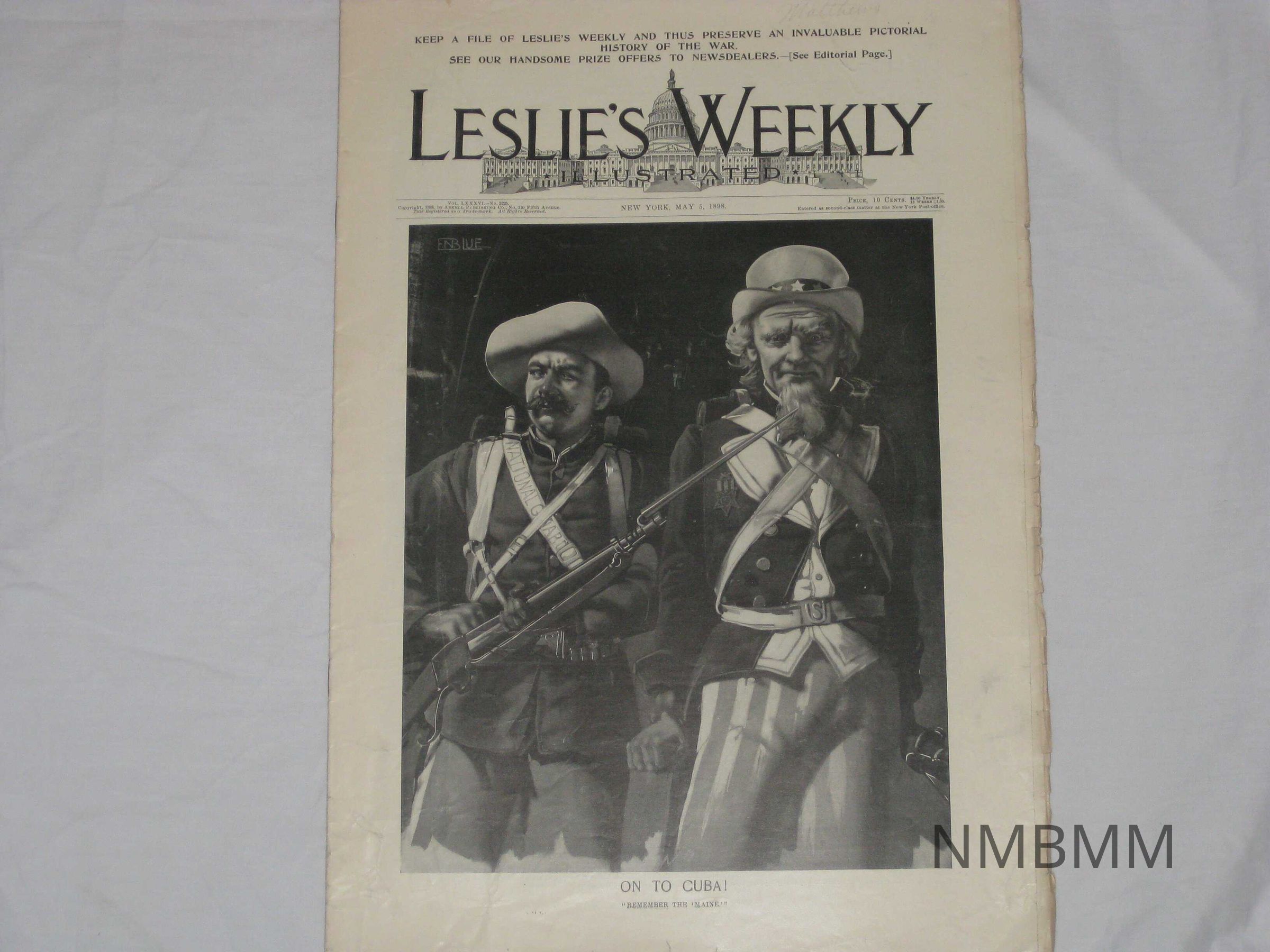An issue of Leslie's Weekly Illustrated, Vol. LXXXVI No. 2225. It was copyrighted by the Arkell Publishing Company on 110 Fifth Avenue and published in New York on May 5, 1898. The front cover features an illustration of a national guardsmen and uncle sam with the title "On to Cuba" and the quote "Remember the Maine" At the top it reads "Keep a file of Leslie's Weekly and thus preserve an invaluable pictorial history of the war. See our handsome prize offers to newsdealers."Collection