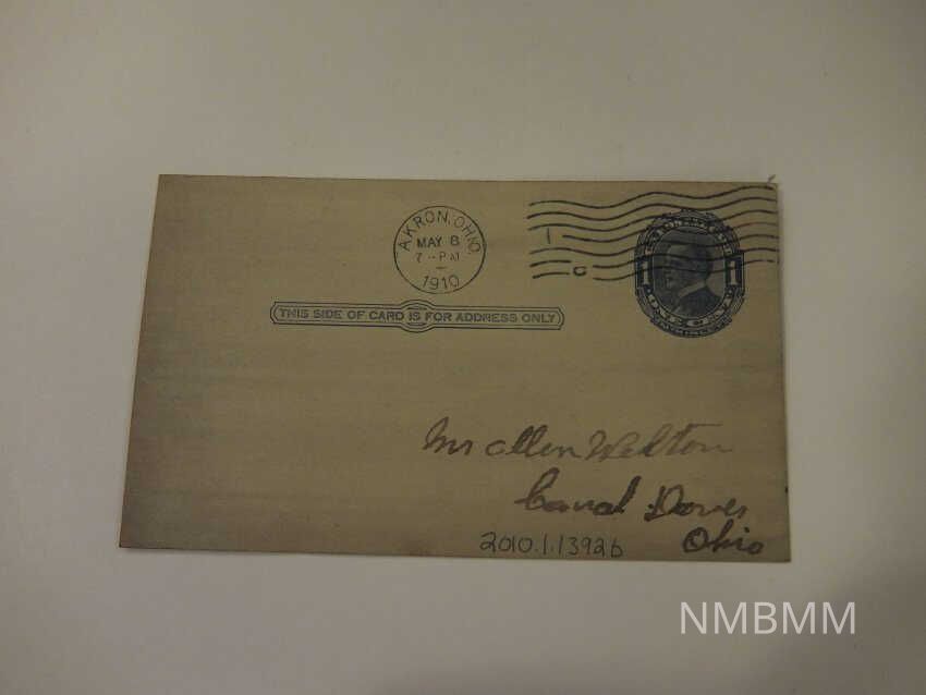 This item is a postcard is by the Universal Postal Union of the United States America. It contains a printed stamp with President McKinley's portrait. The writing on the back reads, "Akron, Ohio 8, 1910. Just a word to say Aunt Jane passed away this morning. Funeral at 2:30 from the home on Franklin St. Come if you can."Collection