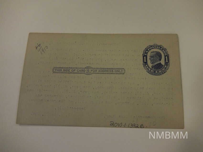 This item is a postcard contains a printed blue stamp with a portrait of President McKinley.The back reads, " Indianapolis, Indiana, September 16, 1910. I am mailing you a September Wood-Worker herewith. Will you please look clear through it carefully! If it doesn't come to your plant regularly, you couldn't invest $1.00 to better advantage. It helps in management, in cost keeping, in machine operations. Some of the best wood-working specialists in the world contribute to it regularly, and you get itself ideas for a very low cost. Your men will be the better for reading iy, and through them the subscription price will be returned many times. One copy, one year, $1.00; two copies, one year, $1.50; three copies, one year, $2.00. Subscriptions received by October 15, will include October, November and December, 1910, numbers, and all of 1911, at the rate above. Respectfully, S. H. Smith, Pub. 208 Commercial Club Bldg."