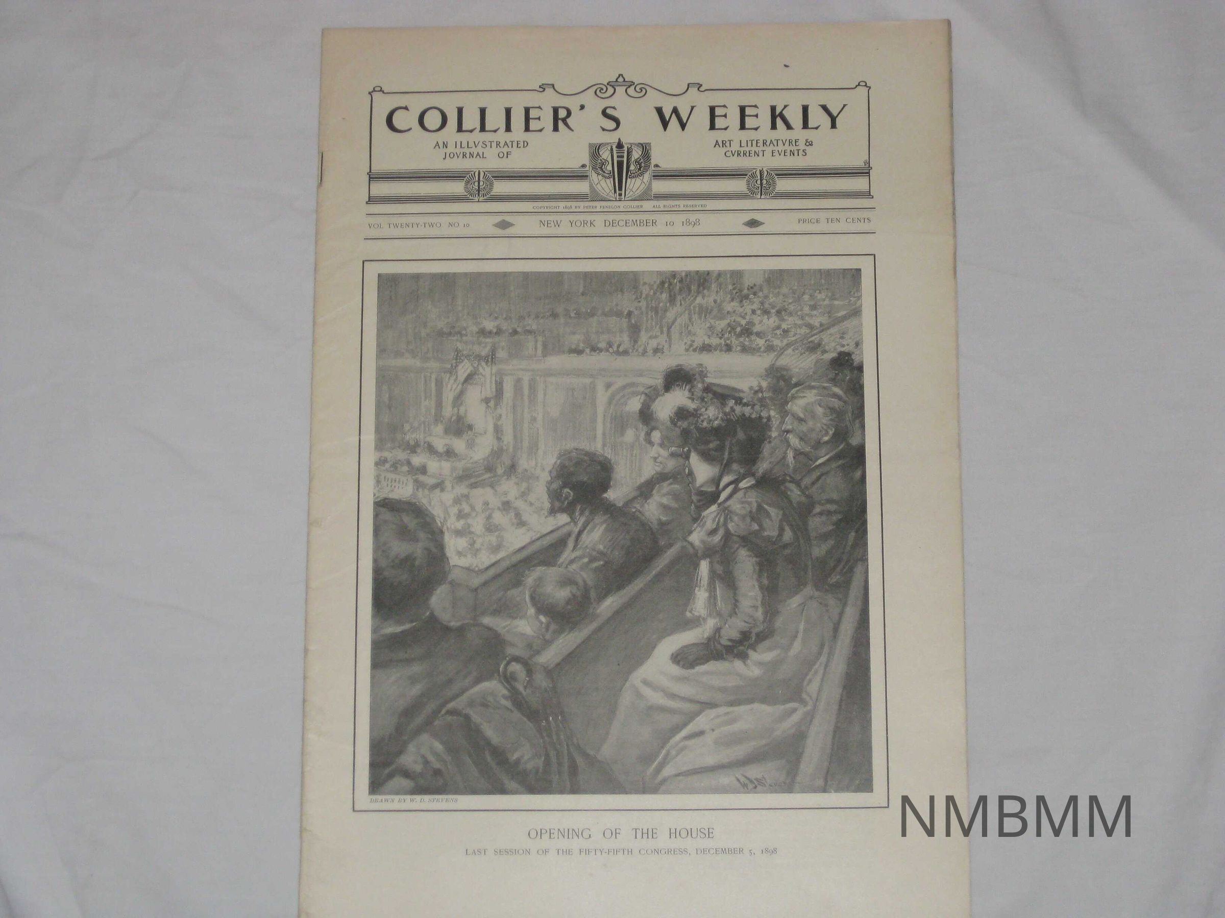 An issue of Collier's Weekly, an illustrated journal of art, literature and current events, Vol. 22 No. 10, published December 10, 1898 in New York by Peter Fenelon Collier. The issue features an illustration of people watching a session of congress. It has the title "Opening of the House" and the caption "Last session of the fifty-fifth congress, December 5, 1898.Collection