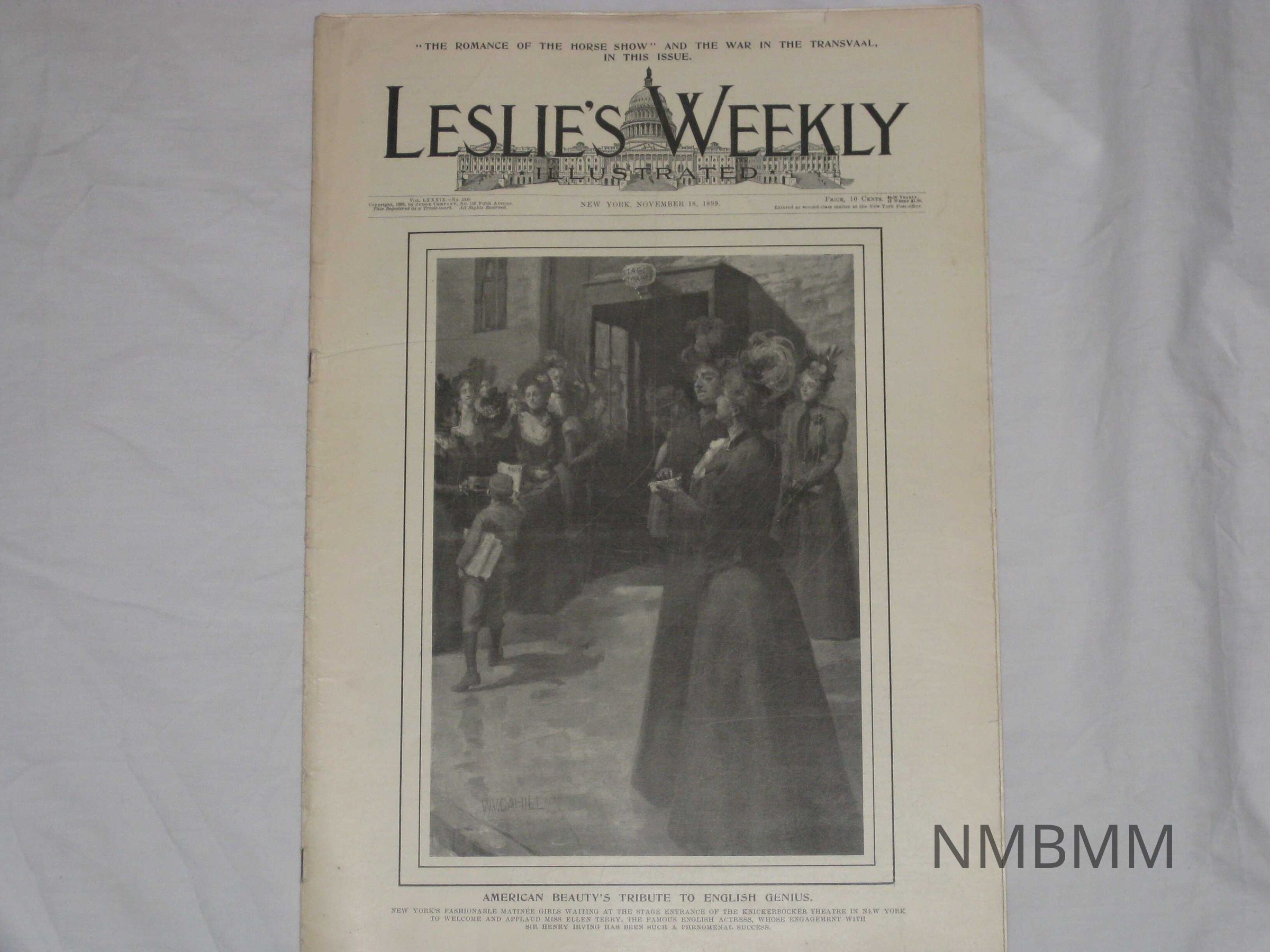 An issue of Leslie's Weekly Illustrated, Vol. LXXXIX No. 2306, it was copyrighted by the Judge Publishing Company in New York on November 18, 1899. The front cover features an illustration of women standing around a stage entrance and a little boy selling papers. The title reads "American Beauty's Tribute to English Genious" with the caption "New York's fashionable matinee girls waiting at the stage entrance of the Knickerbocker Theatre in New York to welcome and applaud Miss Ellen Terry, the famous English actress, whose engagement with Sir Henry Irving has been such a phenomenal success." At top it reads "The Romance of the Horse Show" and the war in the Transvaal, in this issue.