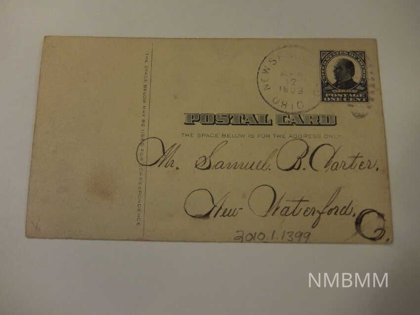 This item is a postcard containing a printed stamp of with a portrait of President McKinley. The card is addressed to Mr. Samuel B. Carter of New Waterford, Ohio. The back provides details of the Office of Springfield Township Mutual Fire Insurance Association.Collection