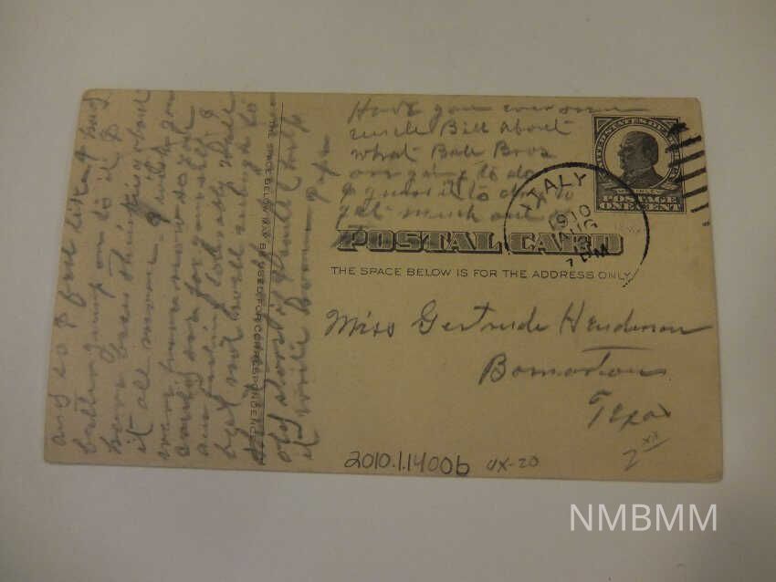 This item is a postcard containing a printed stamp of with a portrait of President McKinley. The card is addressed to Miss Gertrude Hardman of Texas, from her Papa in Italy.