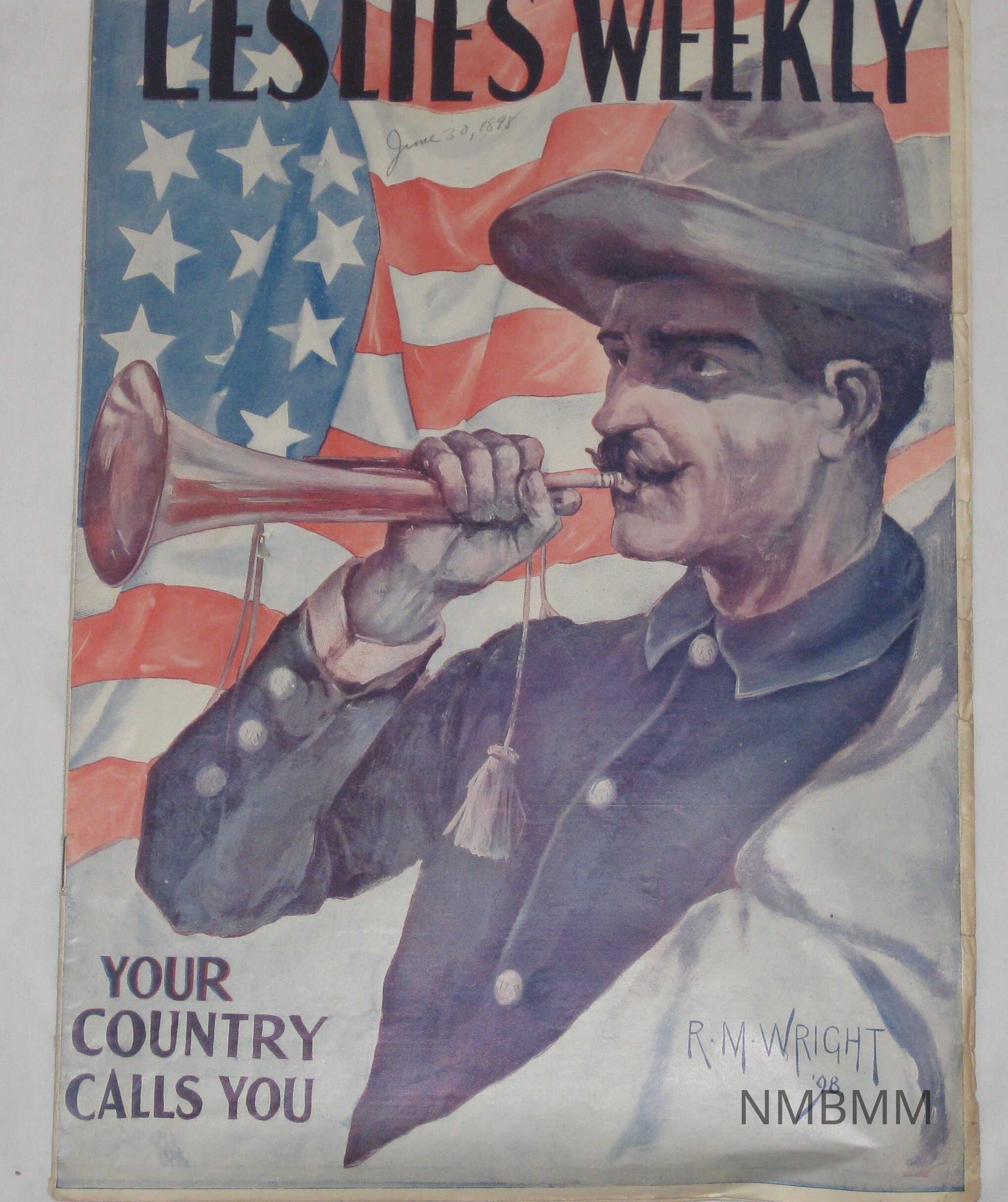 An issue of Leslie's Weekly Illustrated, Vol. LXXXVI No. 2233, it was copyrighted by the Arkell Publishing Company in New York on June 30, 1898. The front cover features a colored illustration of a solider blowing a horn with the words "Your Country Calls You". The inside cover features an illustration of American soldiers writing letters with the title, "Writing Home From the Front." and the caption "The hurried last letter written as the camp at Tampa breaks up before the departure for Cuba." At the top it reads "One dollar will pay for a subscription to Leslie's Weekly, from date of subscription until November 1st. See our extra offer."Collection
