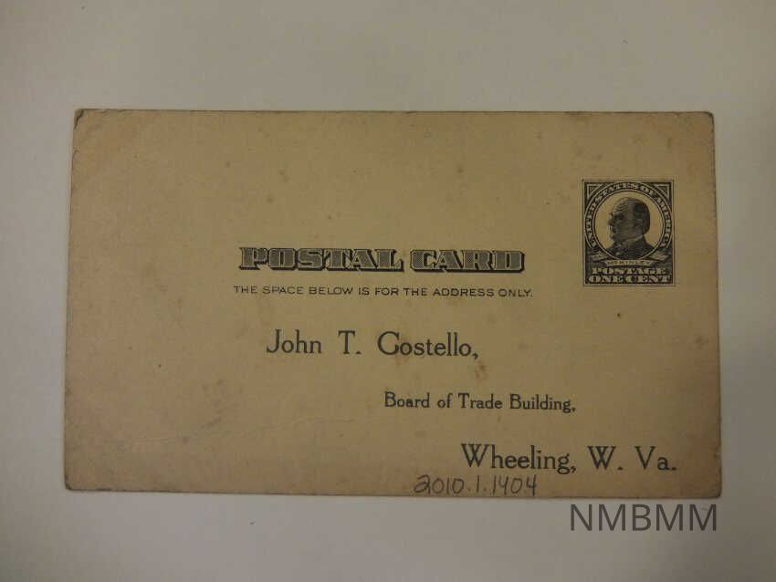 This item is a postcard containing a printed stamp of with a portrait of President McKinley. The letter is addressed to Mr. John T. Costello, Board of Trade Building in Wheeling, West Virginia. The back reads, "Dear Sir: I shall be pleased to receive further particulars, provided it be without cost or exoense to me or obligation of any knind."Collection