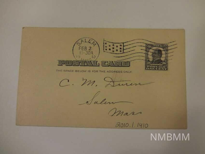 This item is a postcard containing a printed stamp of with a portrait of President McKinley. The card is addressed to Chas. M. Duren from Salem, Massachusetts. The back reads, "Winslow Lewis Commandery, K.T. Sir Knight: You are requested to report at the armory Thursday at 1p.m. for the purpose of attending the funeral services of our late Prelate Sir Knight W.W. Eaton. Special car at 1:15p.m. Full Tmeplar Regelia, white goves. C.S. Chase, E.C., Al Dennett, Rec."