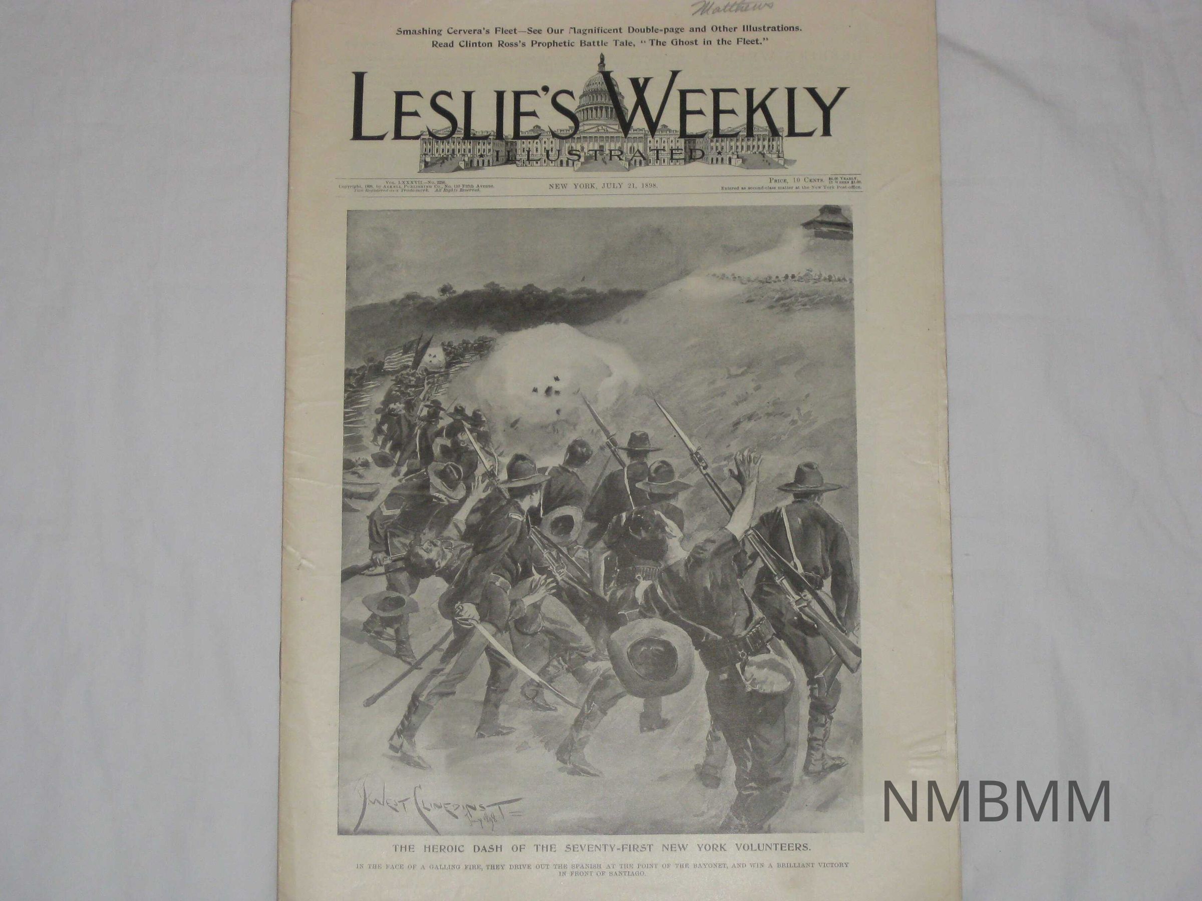 An issue of Leslie's Weekly Illustrated, Vol. LXXXVII No. 2236, it was copyrighted by the Arkell Publishing Company in New York on July 21, 1898. The front cover features a drawing of U.S. soldiers fighting a battle with some being wounded with the title "The Heroic Dash Of The Seventy-First New York Volunteers" and the caption, "In The Face Of A Galling Fire, They Drive Out The Spanish At The Point Of The Bayonet, And Win a Brilliant Victory In Front of Santiago."Collection