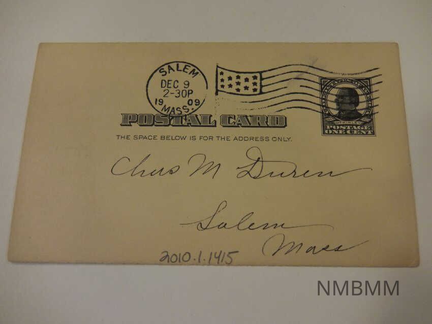 This item is a postcard containing a printed stamp of with a portrait of President McKinley. The card is addressed to C.M. Duren of Salem, Massachusetts. The back reads, "Rehearsal of Temple degree will be held Dec. 15, 1909 at 8 o'clock. You are requested to be present. C.S. Chase, E.C."Collection