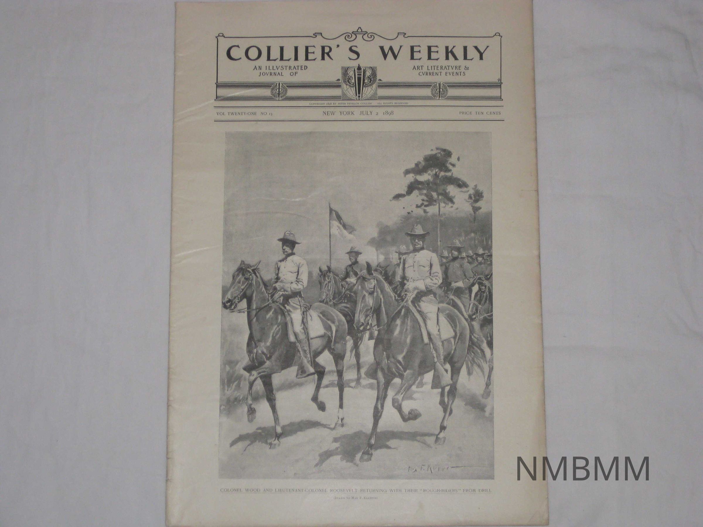 An issue of Collier's Weekly, an illustrated journal of art, literature and current events, Vol. 21 No. 13, published July 2, 1898 in New York by Peter Fenelon Collier. The issue features a drawing by Max F. Klepper of Teddy Roosevelt and the Rough Riders. The title reads "Colonel Wood and Lieutenant-Colonel Roosevelt Returning With Their 'Rough-Riders' From Drill"Collection