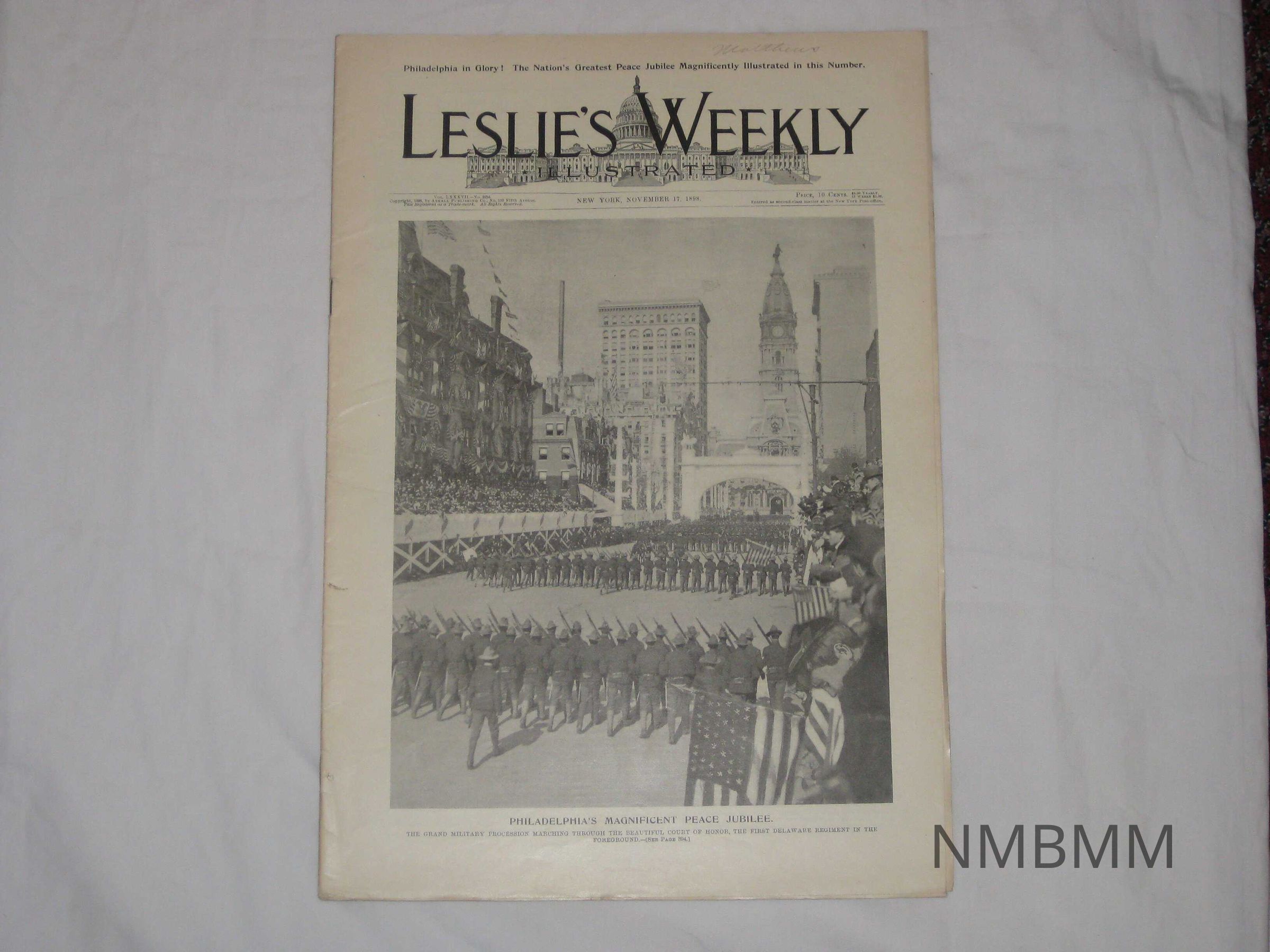 An issue of Leslie's Weekly Illustrated, Vol. LXXXVII No. 2253, it was copyrighted by the Arkell Publishing Company in New York on November 17, 1898. The front cover features an image of a military procession with the title "Philadelphia's Magnificent Peace Jubilee." The caption reads, "The Grand Military Procession Marching Through The Beautiful Court of Honor, The First Delaware Regiment In The Foreground."Collection