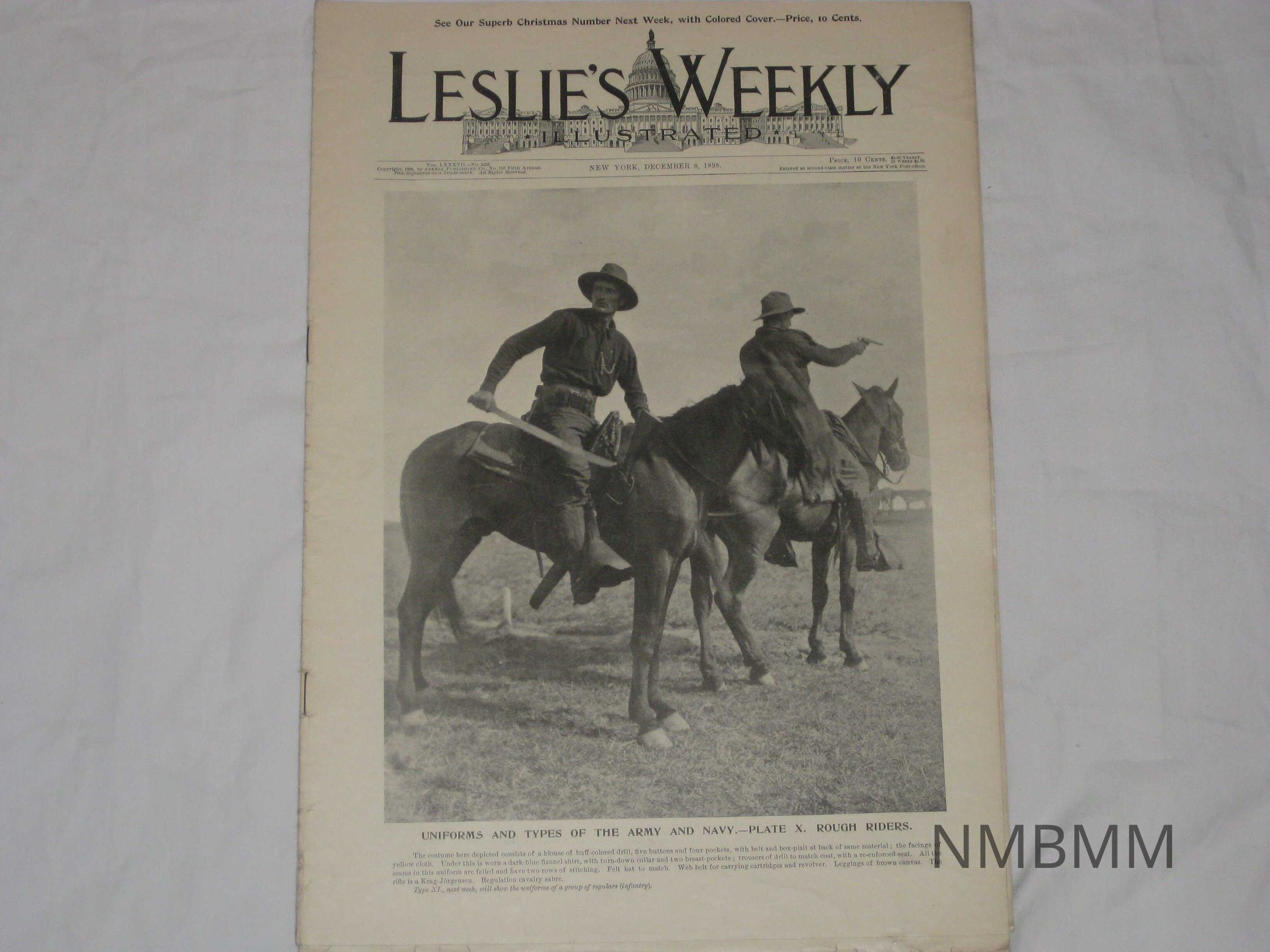 An issue of Leslie's Weekly Illustrated, Vol. LXXXVII No. 2256, it was copyrighted by the Arkell Publishing Company in New York on December 8, 1898. The front cover features an image of two rough riders riding upon their horses with the title "Uniforms And Types Of The Army And Navy.--Plate X. Rough Riders." The caption reads, "The costume here depicted consisits of a blouse of buff-colored drill, five buttons and four pockets, with belt and box-plait at back of same material; the facings of yellow cloth. Under this is worn dark-blue flannel shirt, with turn-down collar and two breast-pockets; trousers of drill to match coat, with re-enforced seat. All the seams in this uniform are felled and have two rows of stitching. Felt hat to match. Web belt for carrying cartridges and revolver. Leggings of brown canvas. The rifle is Krag Jorgensen. Regulation cavalry sabre."Collection