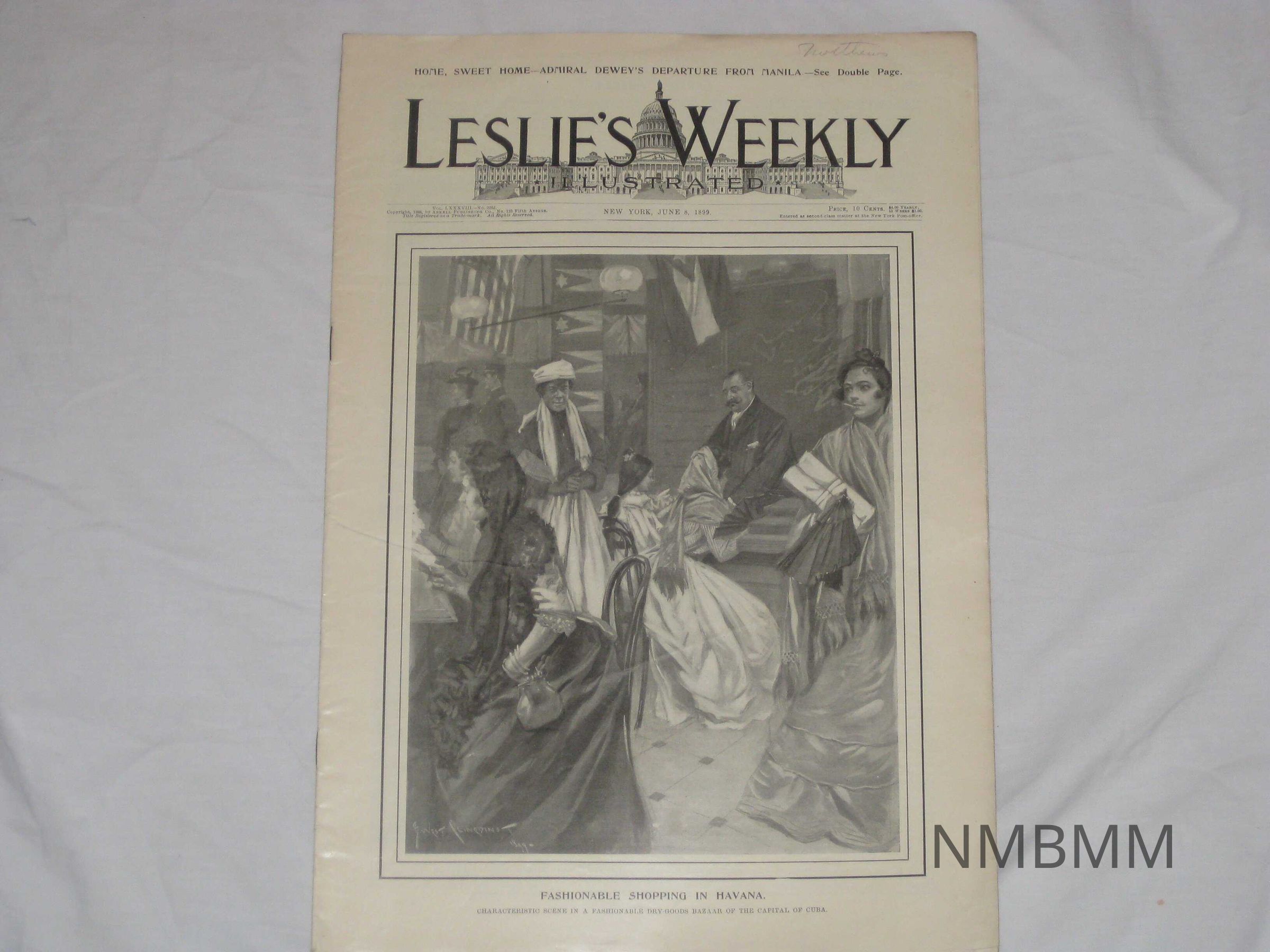 An issue of Leslie's Weekly Illustrated, Vol. LXXXVIII No. 2282, it was copyrighted by the Arkell Publishing Company in New York on June 8, 1899. The front cover features an image of people shopping for dry goods with the title "Fashionable Shopping In Havana." The caption reads,"Characteristic Scene In A Fashionable Dry-Goods Bazaar Of The Capital Of Cuba."Collection