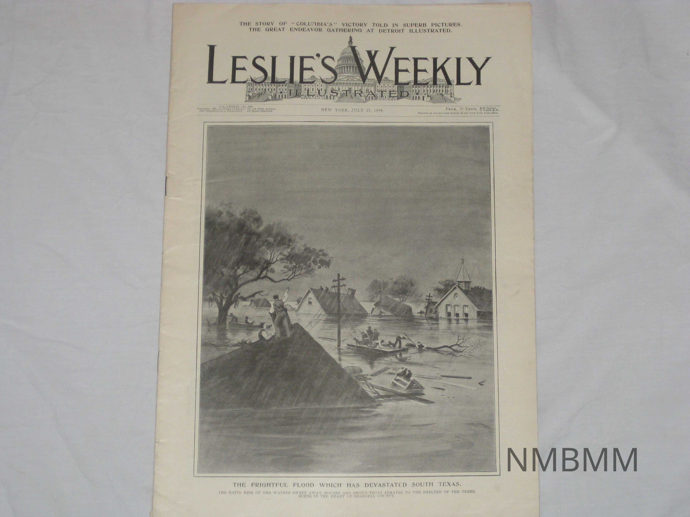 An issue of Leslie's Weekly Illustrated, Vol. LXXXIX No. 2289, it was copyrighted by the Judge Company in New York on July 27, 1899. The front cover features an image of people trying to survive rising flood waters amongst major flood destruction with the title "The Frightful Flood Which Has Devastated South Texas." The caption reads,"The Rapid Rise Of The Waters Swept Away Houses And Drove Their Inmates To The Shelter Of The Trees. Scene In The Heart Of Brazoria County."Collection