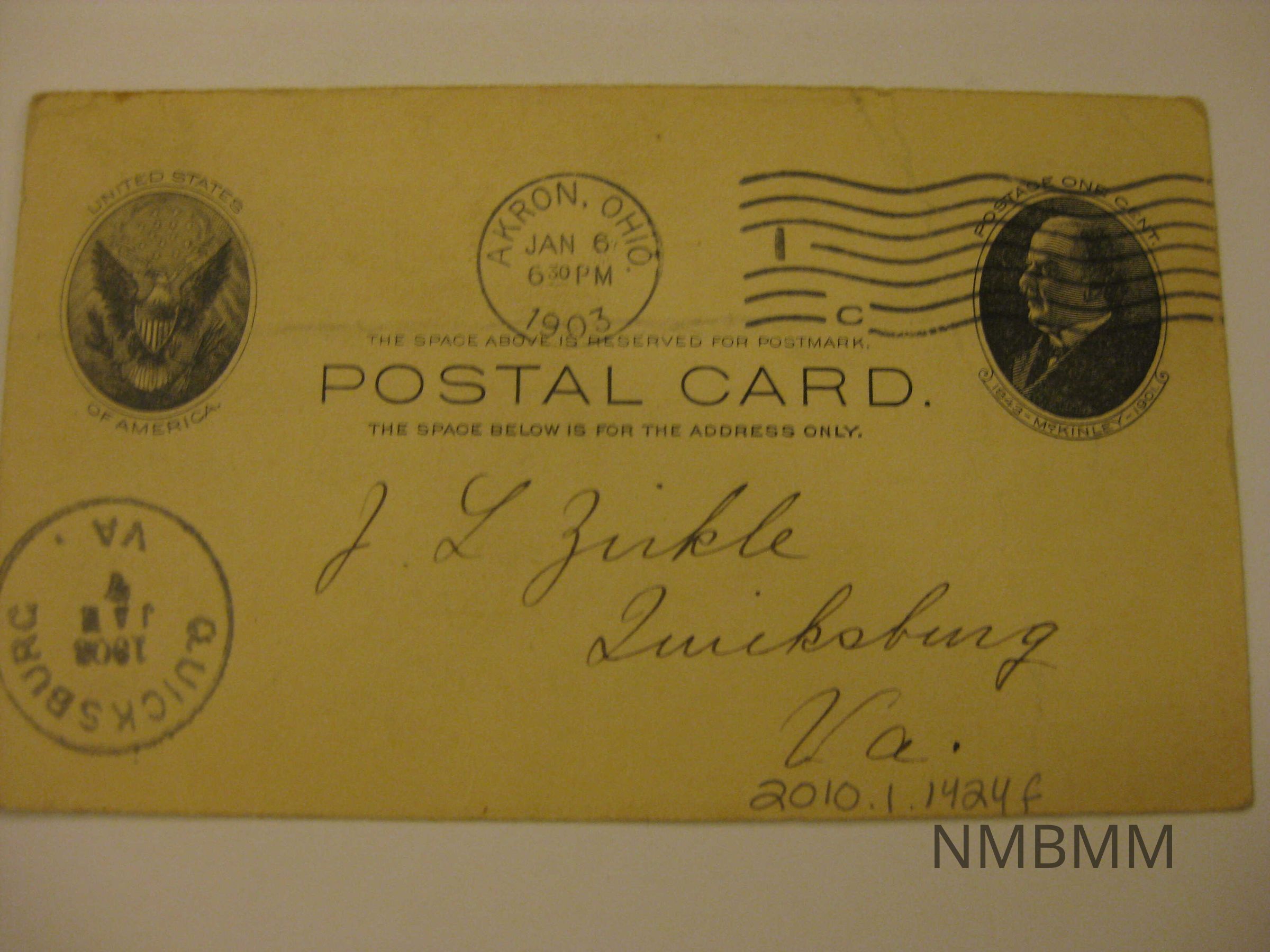 This item is a postcard containing a printed stamp of with a portrait of President McKinley. The card is addressed to J.L. Zirkle of Quicksburg, VA. The back reads, " Dear Sir: We beg to thank you for remittance of Three dollars received this day, which has been duly placed to your credit. Repsectfully yours, The Werner Company."Collection