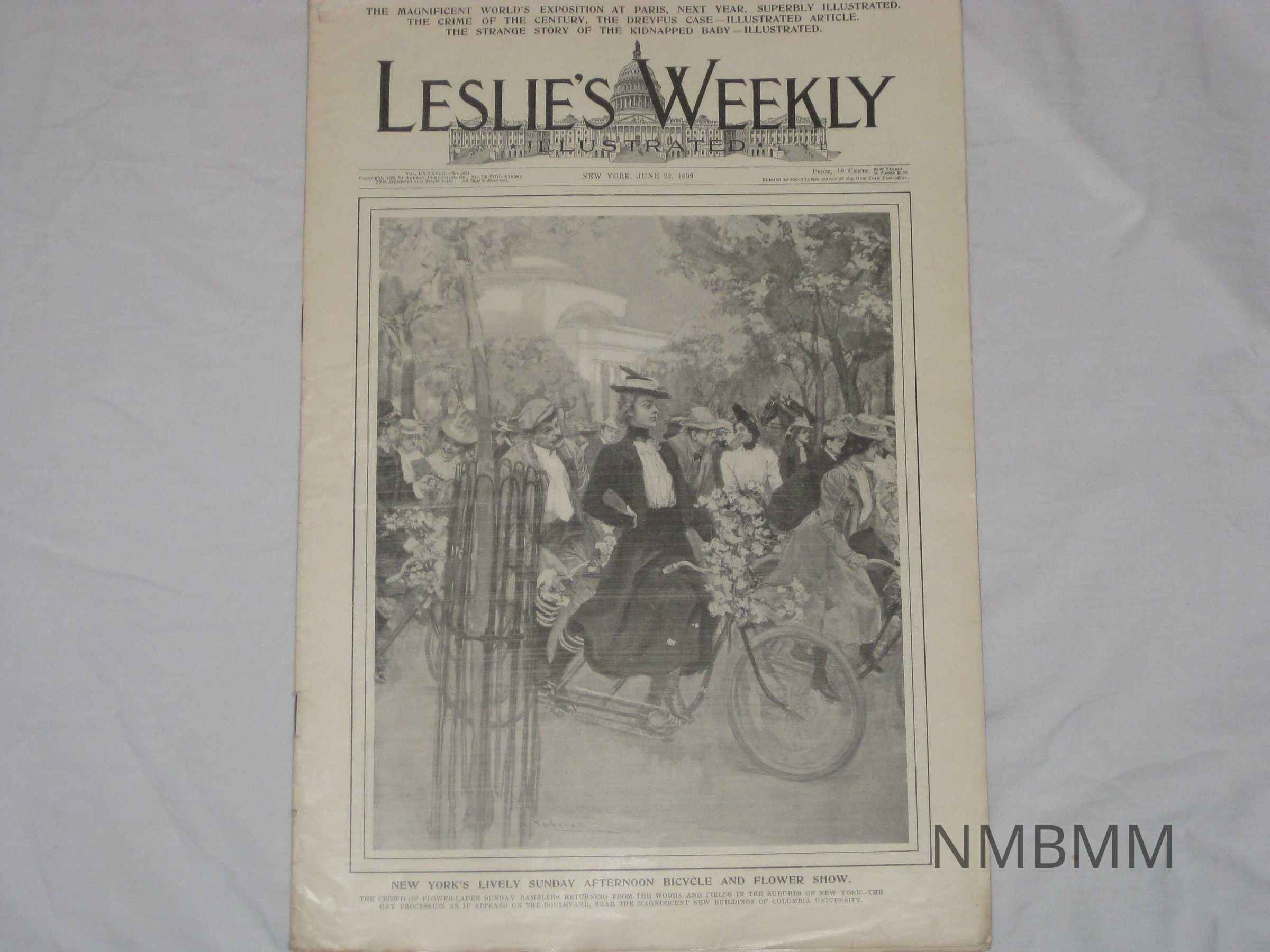 An issue of Leslie's Weekly Illustrated, Vol. LXXXVIII No. 2284, it was copyrighted by the Arkell Publishing Company in New York on June 22, 1899. The front cover features an image of ladies riding their bicycles with the title "New York's Lively Sunday Afternoon Bicycle and Flower Show." The caption reads,"The Crowd of Flower-Laden Sunday Ramblers Returning From The Woods and Fields In The Suburbs Of New York-The Gay Procession As It Appears On The Boulevard, Near The Magnificent New Buildings Of Columbia University."