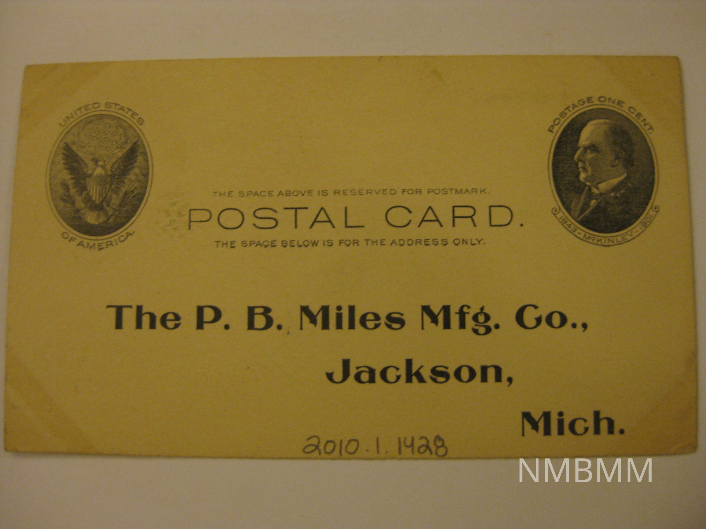 This item is a postcard containing a printed stamp of with a portrait of President McKinley. The card is addressed to The P.B. Miles Mfg. Co., in Jackson, Michigan.