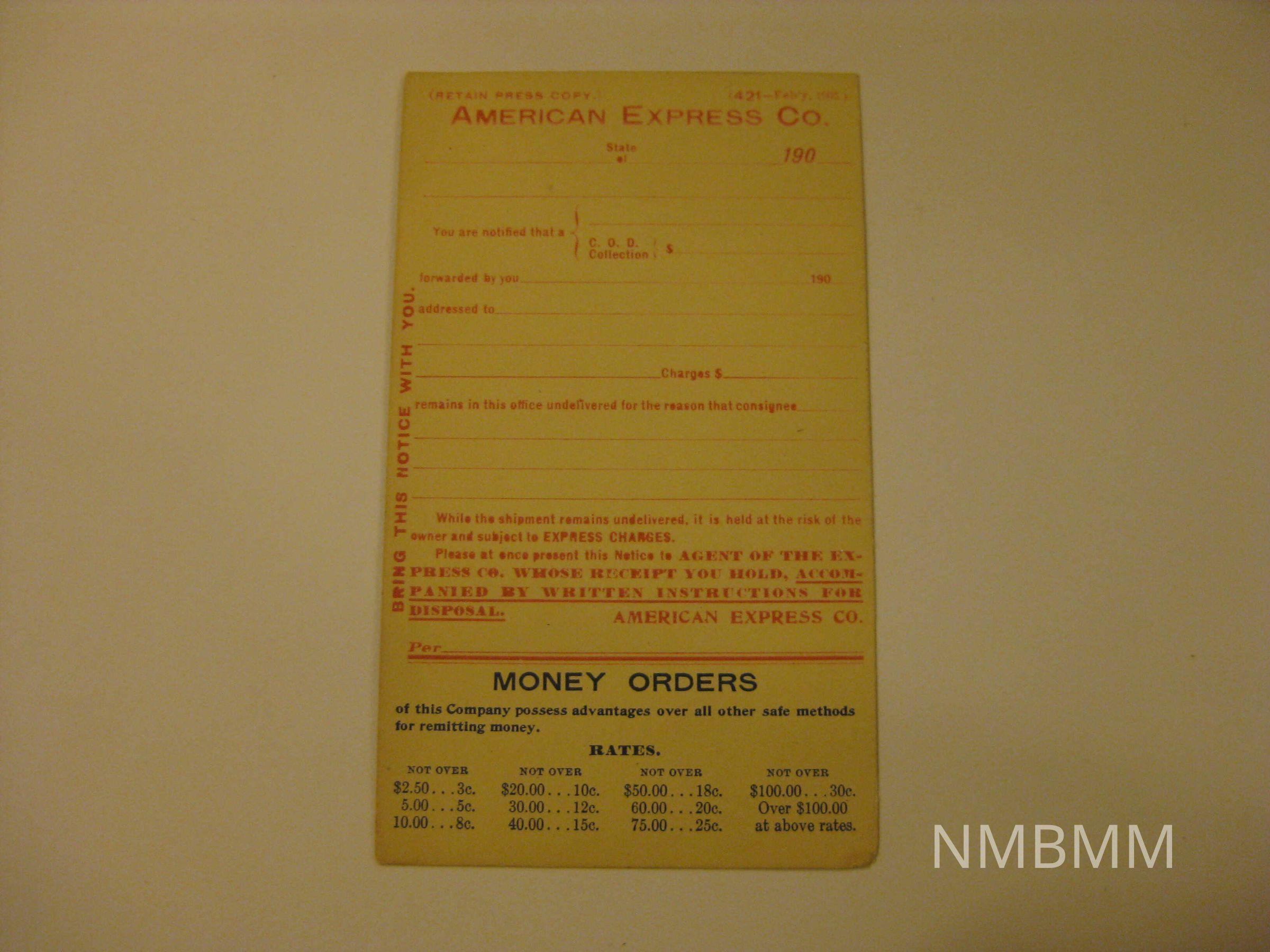 This item is a postcard containing a printed stamp of with a portrait of President McKinley. The card reads, "American Express Company. While the shipment remains undelivered, it is held at the risk of the owner and subjects to express charges. Please at once present this Notice to agent of the express company whose receipt you hold. Accompanied by written instructions for disposal. American Express Company."