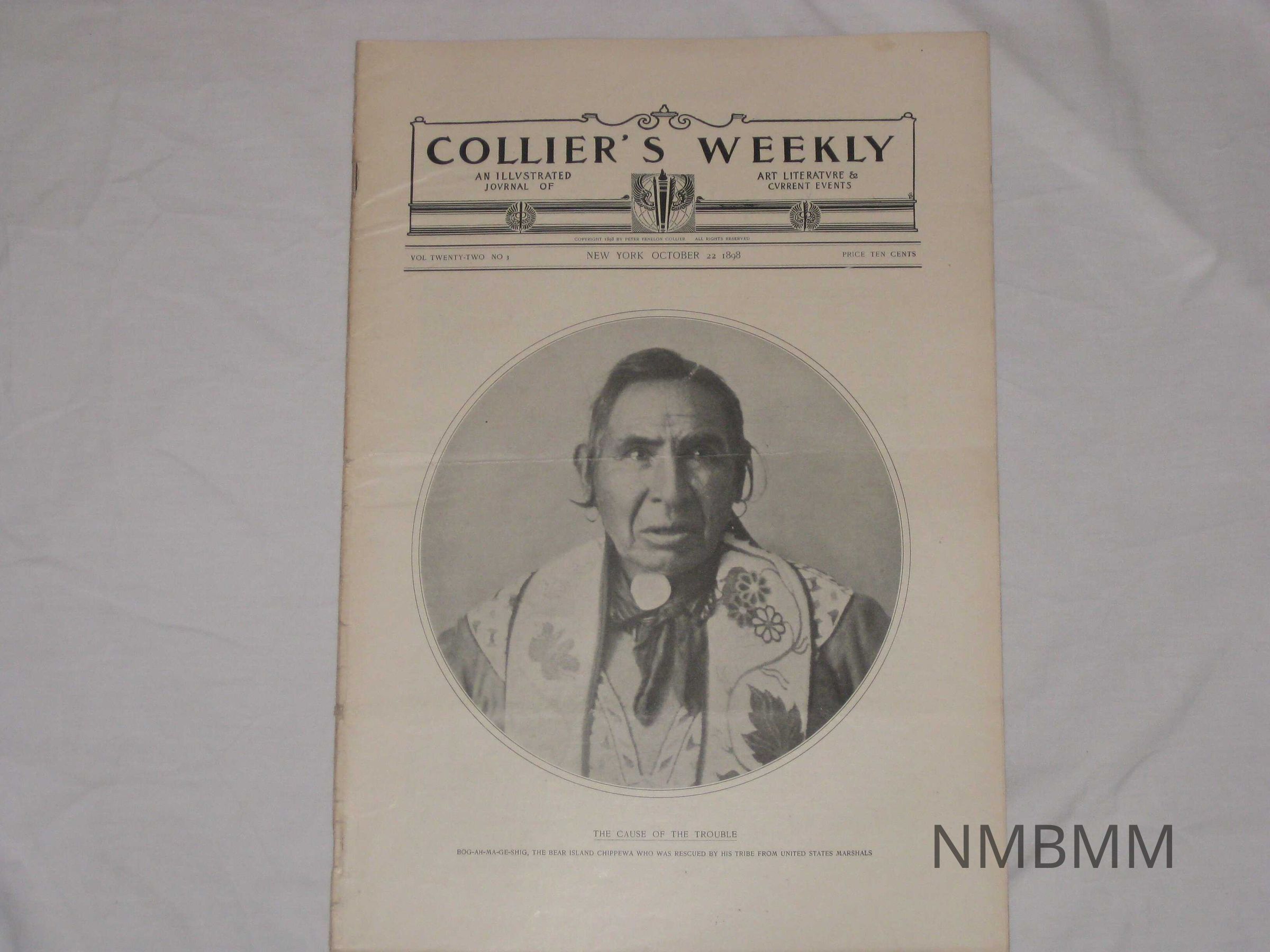 An issue of Collier's Weekly, an illustrated journal of art, literature and current events, Vol. 22 No. 3, published October 22, 1898 in New York by Peter Fenelon Collier. The issue features a portrait of an Indian named BOG-AH-MA-GE-SHIG with the title, "The Cause Of The Trouble." Caption reads, "BOG-AH-MA-GE-SHIG, The Bear Island Chippewa Who Was Rescued By His Tribe From United States Marshals."