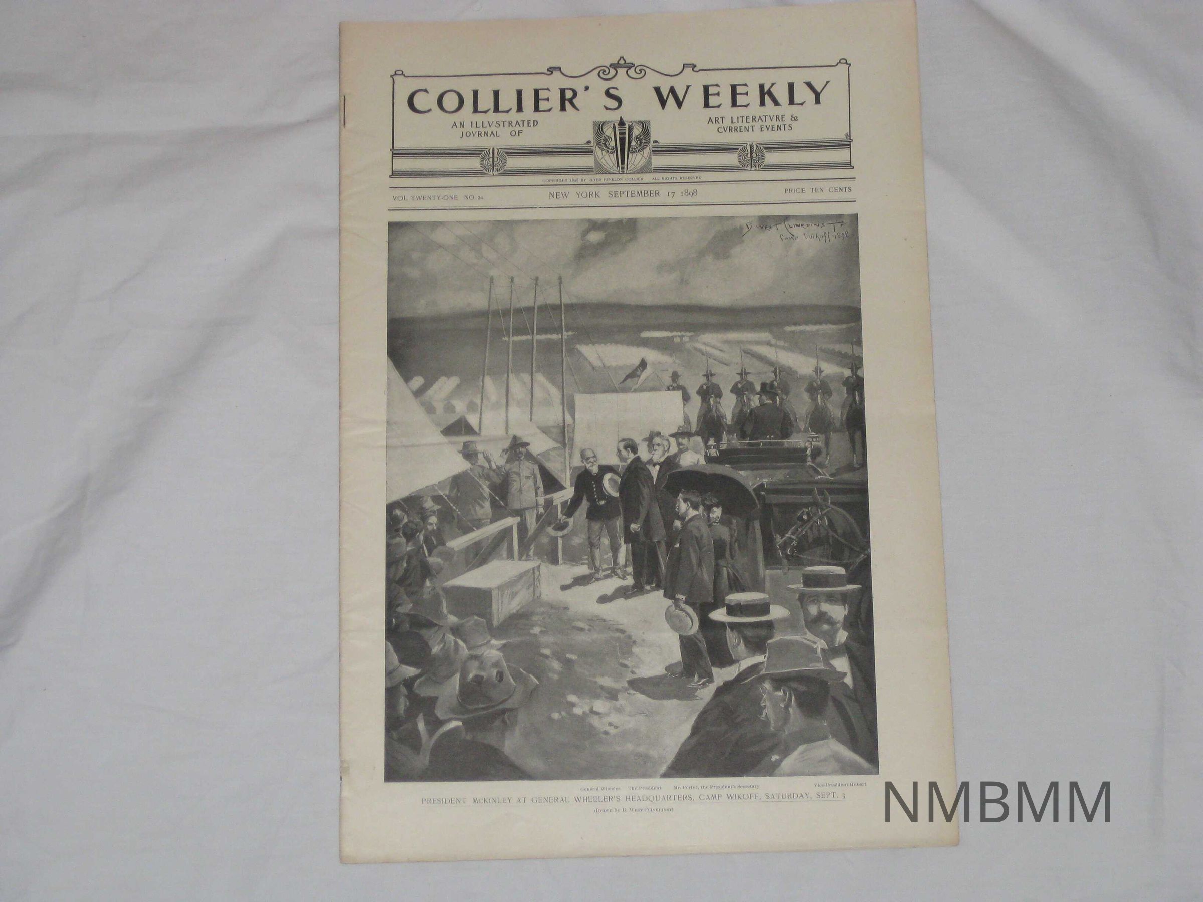 An issue of Collier's Weekly, an illustrated journal of art, literature and current events, Vol. 21 No. 24, with the title, "President McKinley At General Wheeler's Headquarters, Camp Wikoff, Saturday, Sept. 3" published September 17, 1898 by Peter Fenelon Collier. The issue features an illustration by B. West Clinedinst of President McKinley and Vice President Hobart with General Wheeler and other mean at the General's headquarters.