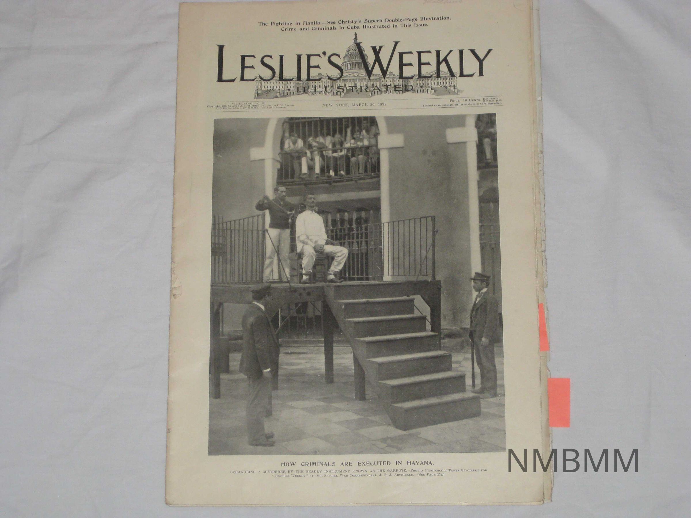 An issue of Leslie's Weekly Illustrated, Vol. LXXXVIII No. 2272, "How Criminals Are Executed In Havana." It was copyrighted by the Arkell Publishing Company in New York on March 30, 1899. The front cover features an image of a murderer being executed. The caption reads, "Strangling A Murderer By The Deadly Instrument Known As The Garrote.-From A Photograph Taken Specially For 'Leslie's Weekly' By Our Special War Correspondent, J.F.J. Archibald."Collection