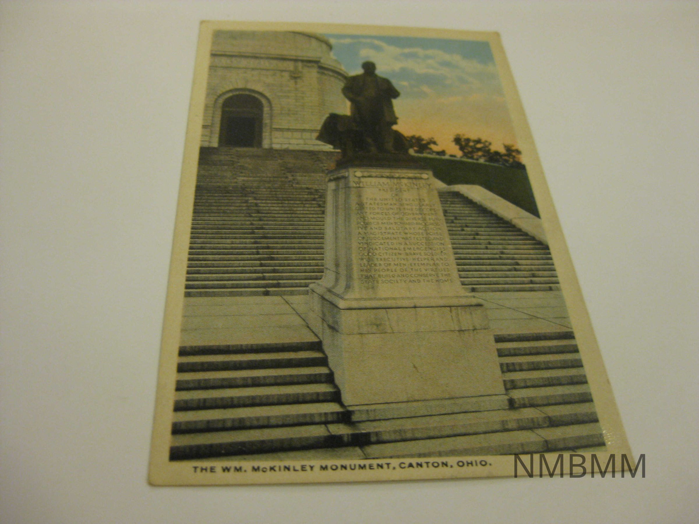 This item is a vertical colored postcard with an image of the McKinley Statue in Canton Ohio. The stairs and statue are visible in picture and the monument in the background. The sky is blue and pink with white clouds. Split Back: Published by L. Schartenberg & Co. Akron, Ohio. Made in U.S.A. C.T. American Art. A-42254.