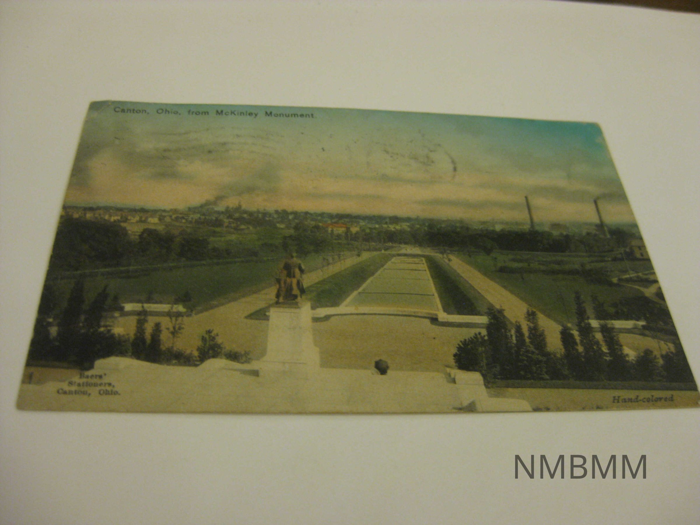 This item is a horizontal colored postcard with an image of the McKinley Statue in Canton Ohio looking out over the reflecting pool and the rest of Canton. Baers' Stationers, Canton, Ohio. Handcolored. Split Back: green one cent Benjamin Franklin stamp, Addressed to Miss Nittie Burton 704 Amelia St. Fredericksburg, Va., Signed Lots of Love Jack, Postmark Canton Aug 17 7-PM 1909 Ohio.Collection