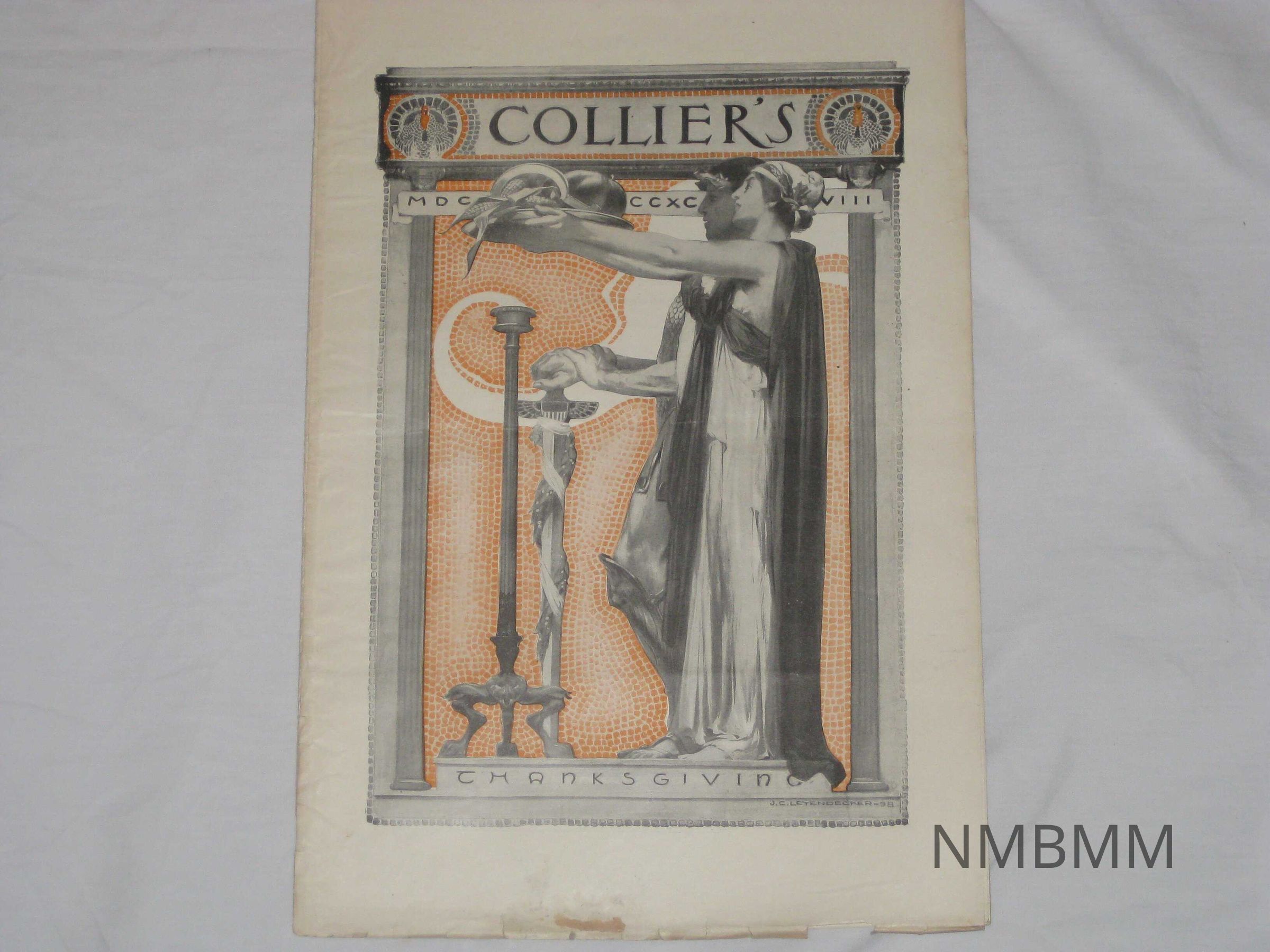 An issue of Collier's Weekly, An Illustrated Journal of Art Literature & Current Events, Vol. 22 No. 7, it was copyrighted by Peter Fenelon Collier on Thanksgiving, 1898. The front cover features a black and orange image featuring Roman figures drawn by J.C. Leyendecker for the Thanksgiving issue.Collection