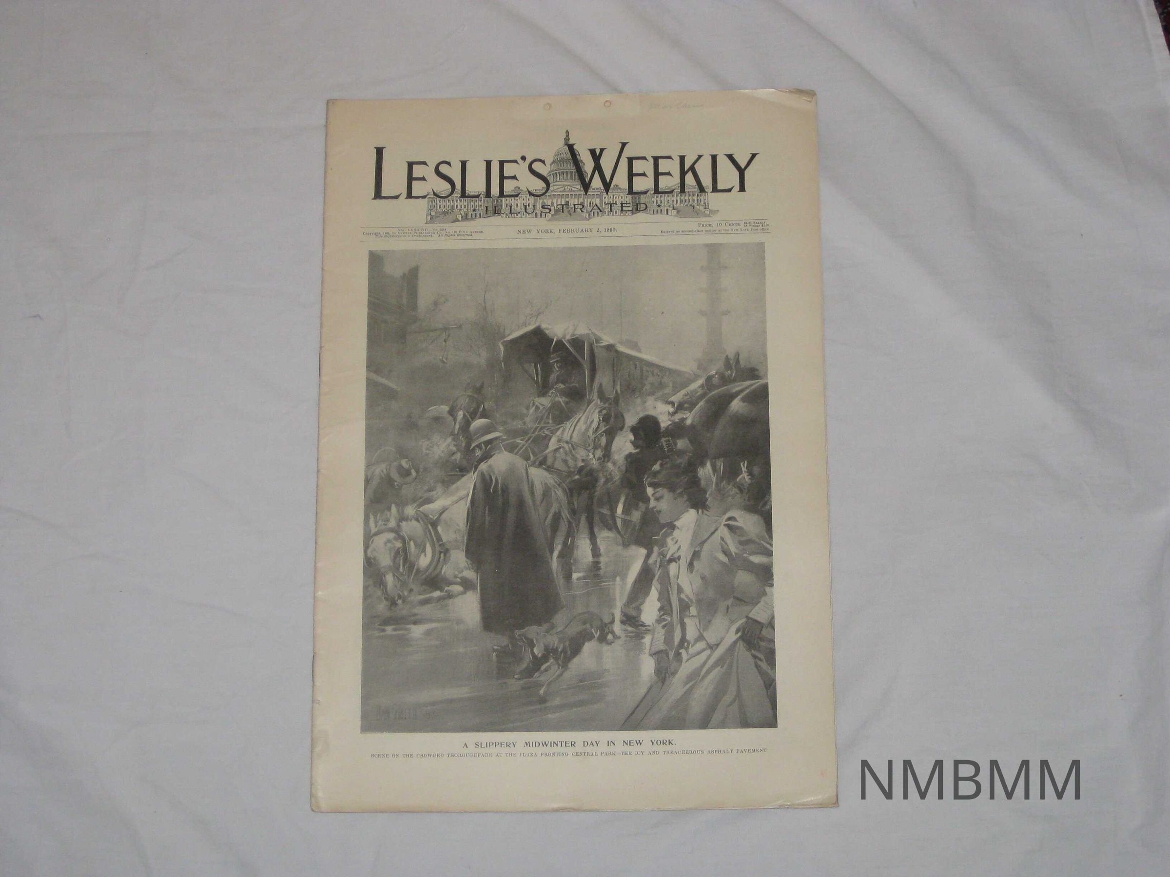 An issue of Leslie's Weekly Illustrated, Vol. LXXXVIII No. 2264, "A Slippery Midwinter Day In New York." It was copyrighted by the Arkell Publishing Company in New York on February 2, 1899. The front cover features an image of horses and people walking on wintry conditions. The caption reads,"Scene On The Crowded Thoroughfare At The Plaza Fronting Central Park-The Icy And Treacherous Asphalt Pavement."Collection