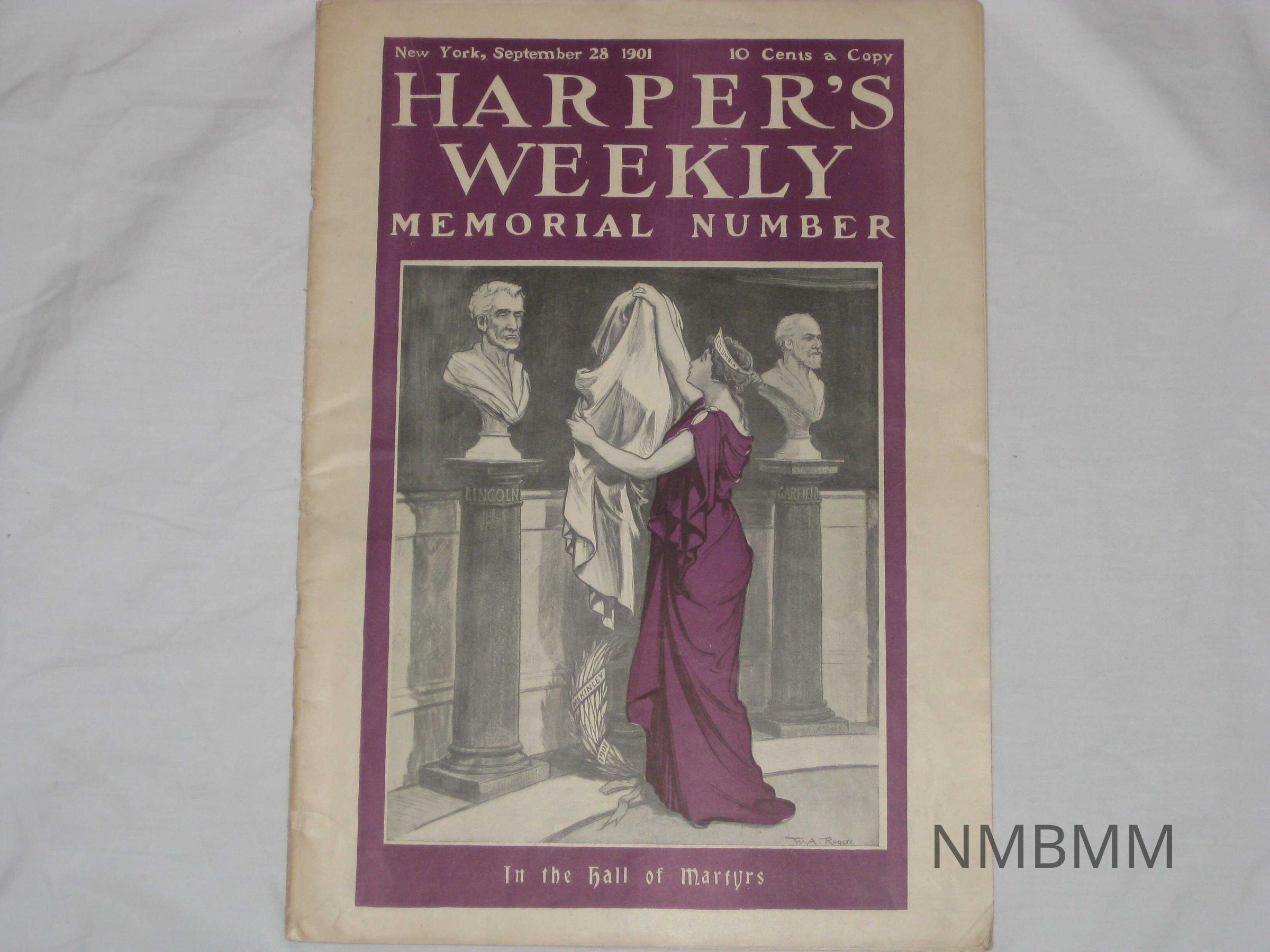 An issue of Harper's Weekly, A Journal of Civilization, Vol. XLV No. 2336 entitled, "Memorial Number." It was copyrighted by Harper and Brothers in New York on September 28, 1901. The front cover features a woman named Columbia dressed in purple putting a sheet over McKinley's bust with olive branches "in the hall of martyrs." His bust is in between Lincoln's and Garfield's.