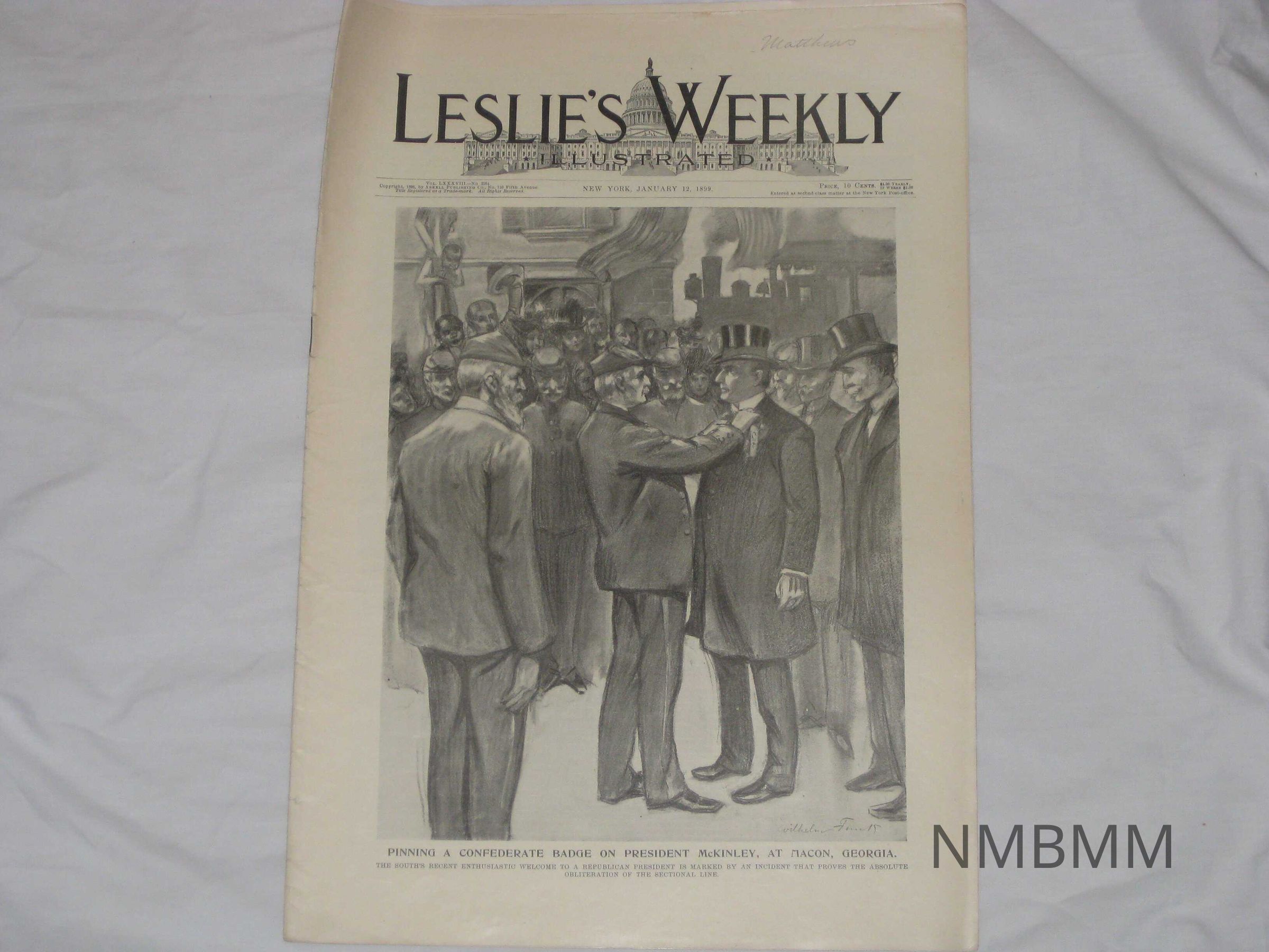 An issue of Leslie's Weekly Illustrated, Vol. LXXXVIII No. 2261, "Pinning A Confederate Badge On President McKinley, At Macon, Georgia." It was copyrighted by the Judge Company in New York on January 12, 1899. The front cover features an illustration of President William McKinley gettinf pinned in front of a crowd. The caption reads, "The South's Recent Enthusiastic Welcome To A Republican President Is Marked By An Incident That Proves The Absolute Obliteration Of The Sectional Line."Collection