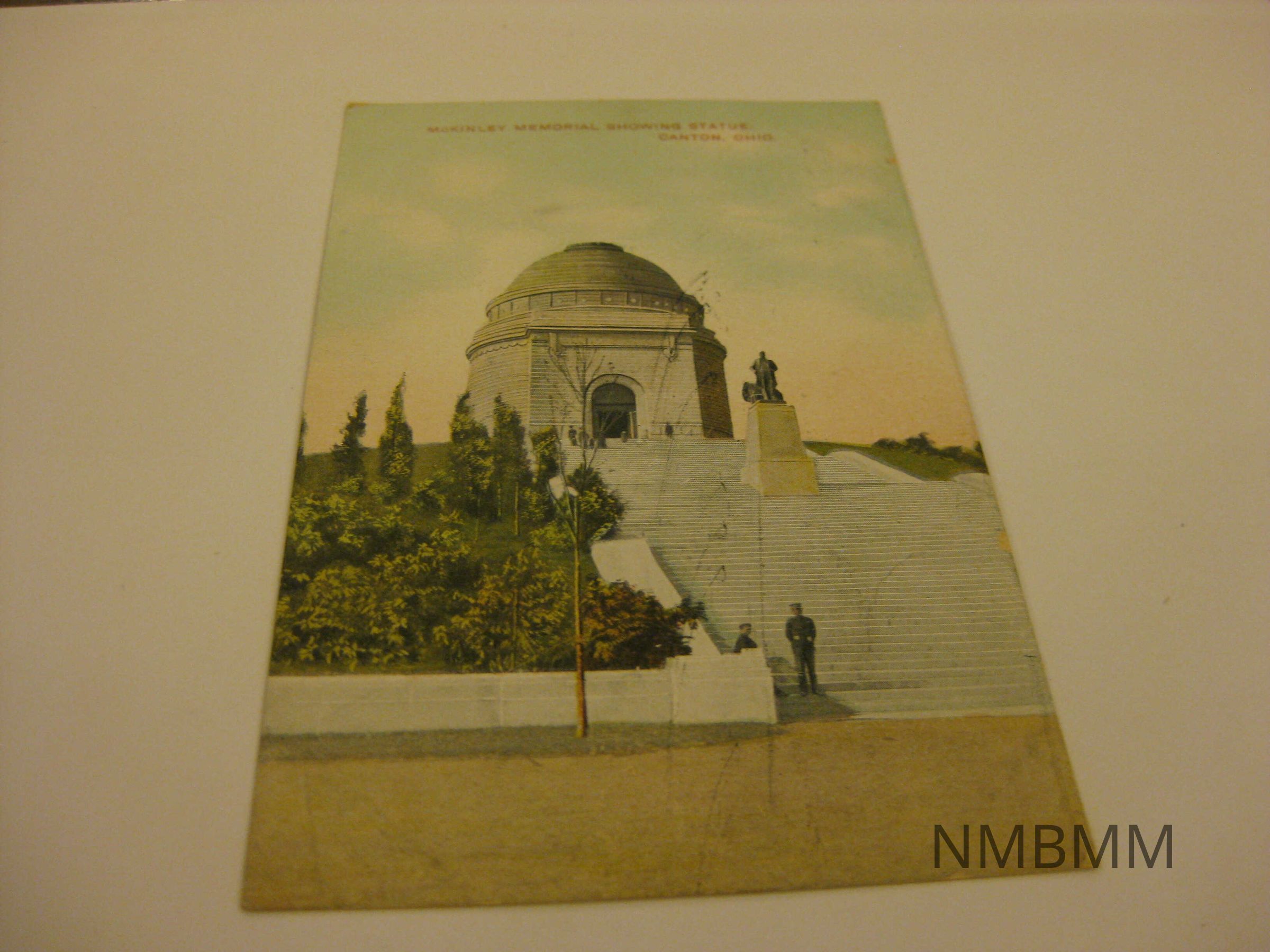 the McKinley Memorial in Canton, Ohio. People are standing on the steps. Two people one of which appears to be a guard are at the bottom of the steps of the memorial. Split Back side: required one cent stamp for domestic mailing. Printed in Germany. Date 10-9-65 in pen.Collection
