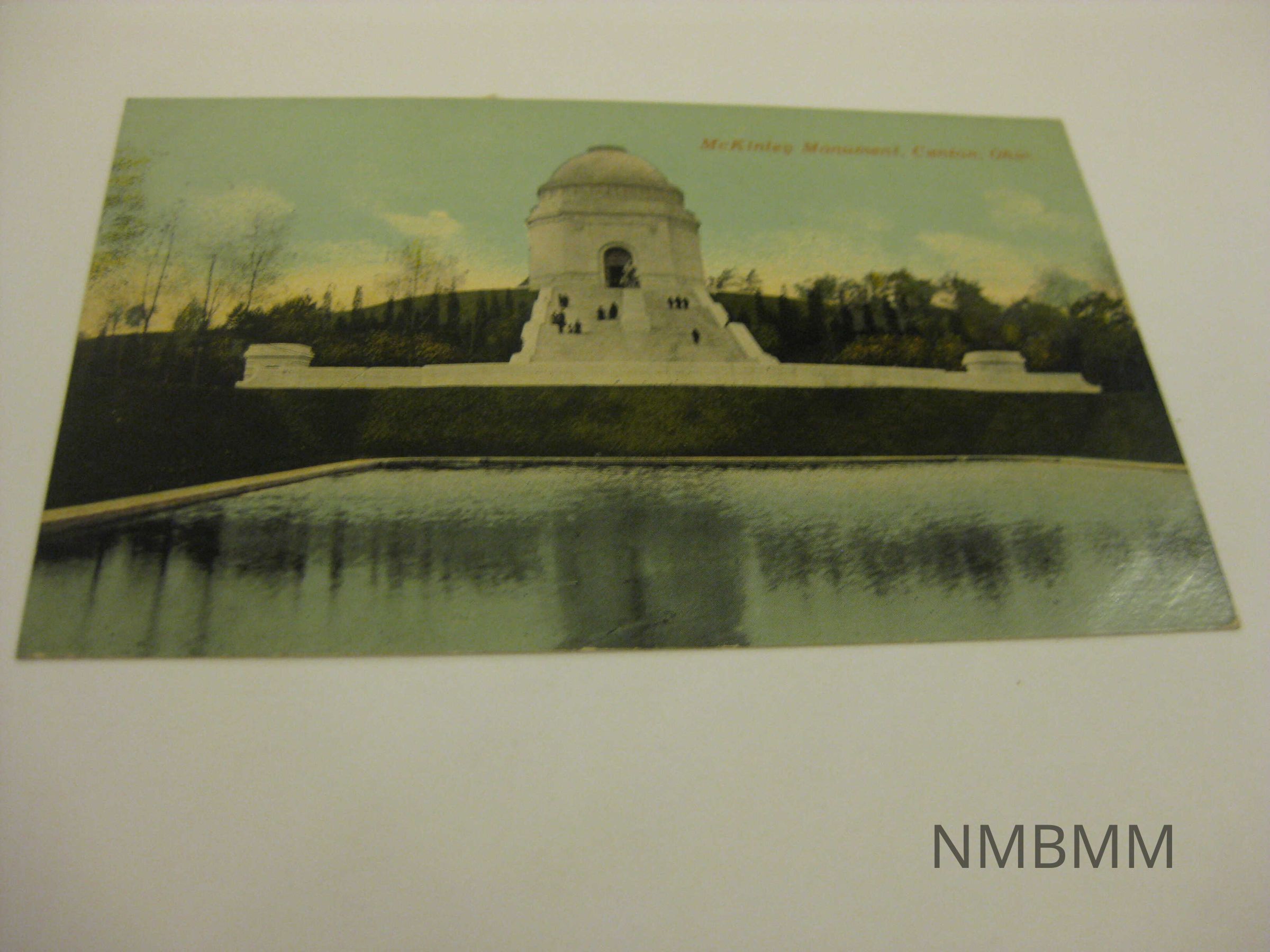 This item is a horizontal colored postcard with an image of the McKinley Memorial including the statue, the reflecting pool, and landscaping. There are people on the stairs. Split Back: one cent stamp for domestic mailing. 14339.