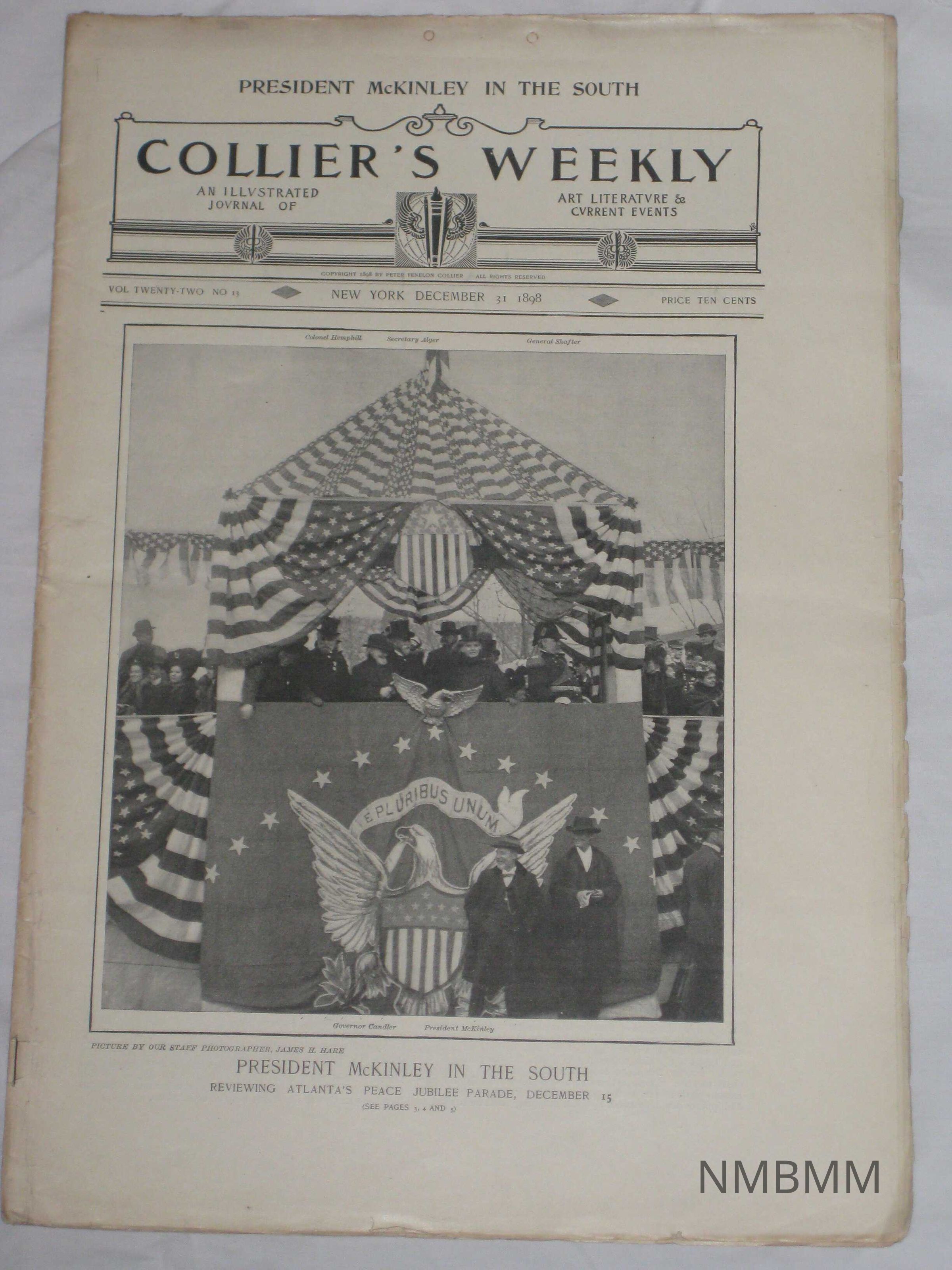 An issue of Collier's Weekly, an illustrated journal of art, literature and current events, Vol. 22 No. 13, with the title, "President McKinley In The South" published December 31, 1898 by Peter Fenelon Collier. The issue features a photograph by James H,. Hare of President McKinley "reviewing Atlanta's Peace Jubilee Parade, December 15."