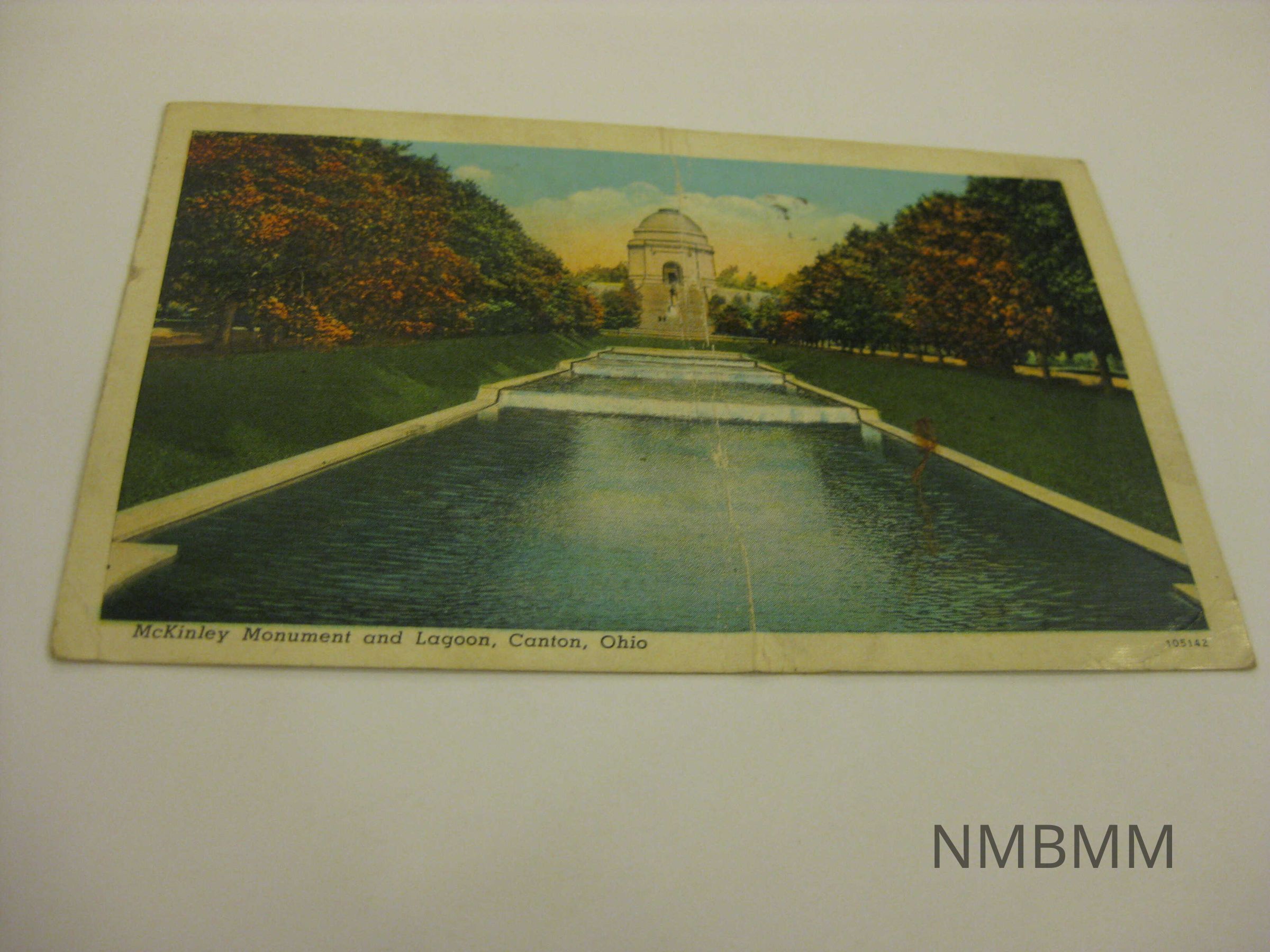 This item is a horizontal colored postcard with an image of the McKinley Monument and lagoon. The clouds and landscaping are also shown. 105142. Split Back: green one cent George Washington stamp, Postmark Canton, Ohio Aug 31 630 PM 1940. Addressed to Lucille Willoughby, Wilsonburg, W. Va. R.I. Boc. 21. Ralph Young Publishing Co., Ohio.Collection