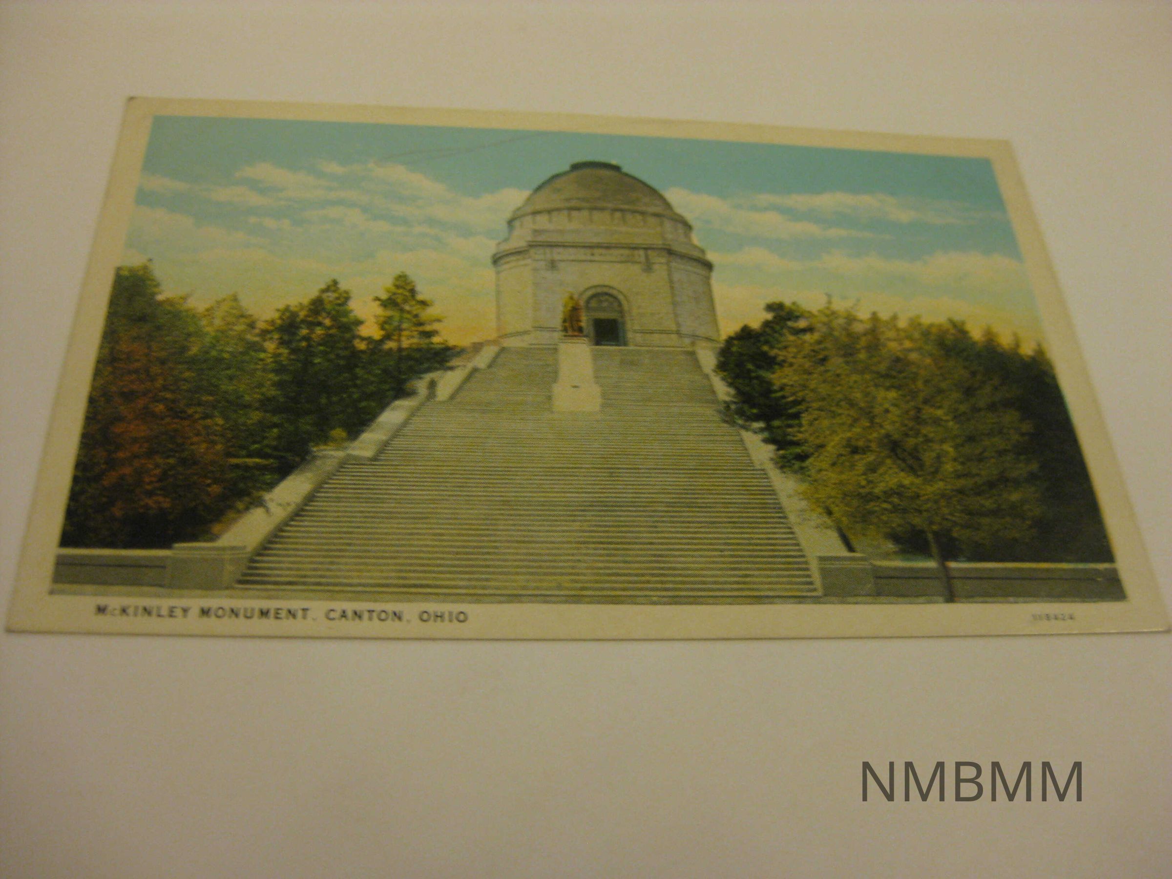 This item is a horizontal colored postcard with an image of the McKinley Monument and statue. Stairs and trees are also shown. 118424. Slim white border. Split Back: one cent stamp needed for mailing, Ralph Young Publishing Co., Ohio. C.T. American Art Colored. Date written in pencil Dec. 1930.Collection