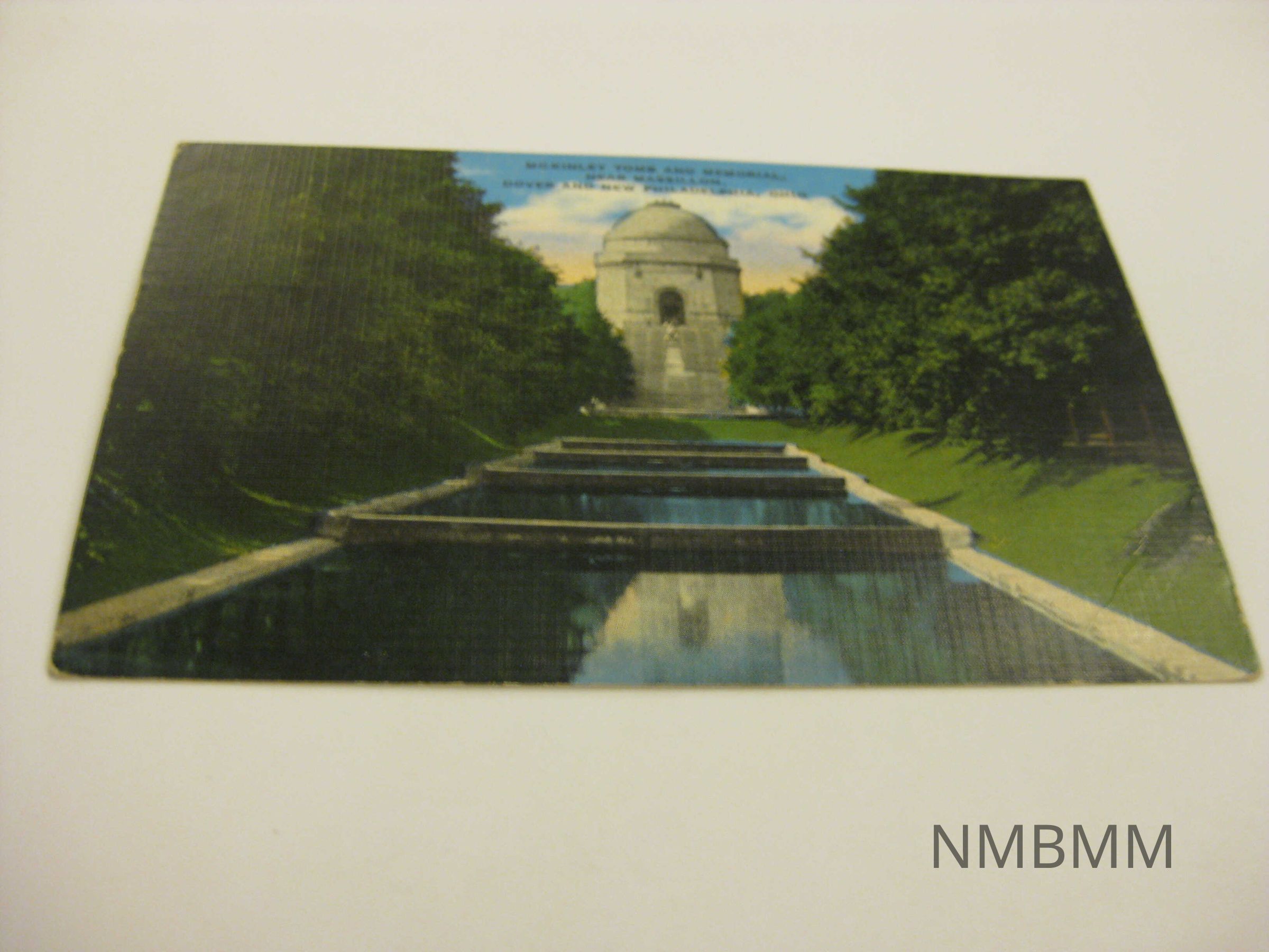 This item is a postcard depicting the McKinley memorial and statue, the relfecting pool, and lots of trees. Backside: It was published by Carl C. Haag News Agency, Massillon, Ohio-Natural Color Post Card Made in U.S.A. By E.C. Kropp Co., Milwaukee, Wis.-(fly) and it is addressed to The Dowds 1021 Oxford Ave N.E. Massillon Ohio. Signed by Dad. Green one cent George Washington stamp. Postmark Richwood, Ohio Jun 6 6-PM 1945. 24342N.