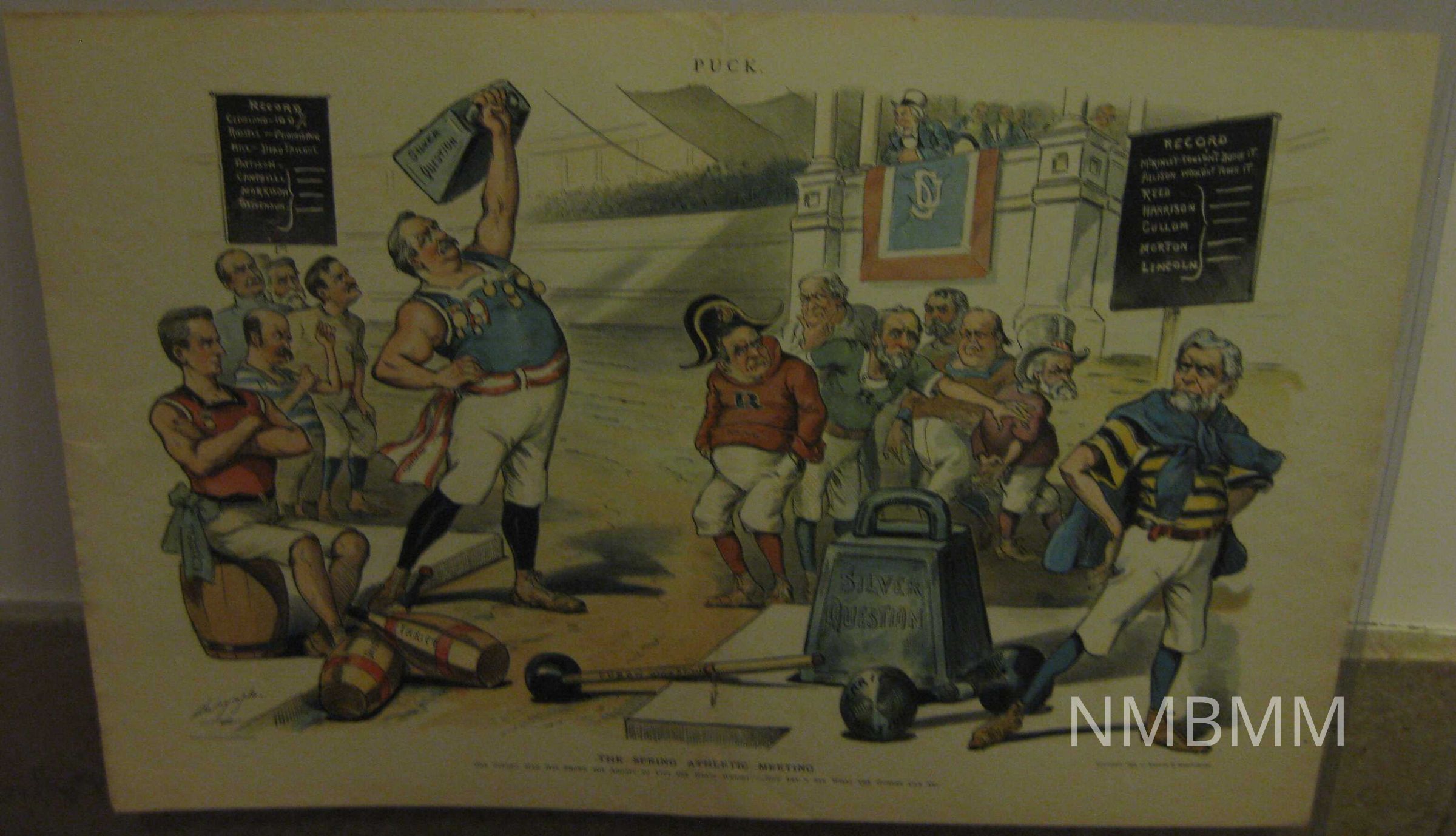 The item is a double page insert from the publication, Puck from 1896. It is a political cartoon depicting an athletic meet between politicians. Uncle Sam is looking on from the stands. The caption says, "One strong man has shown his ability to lift the heavy weight;-Now let's see what the others can do." On the backside, more cartoons and comments are displayed. The item is in a plastic sleeve for protection.Collection