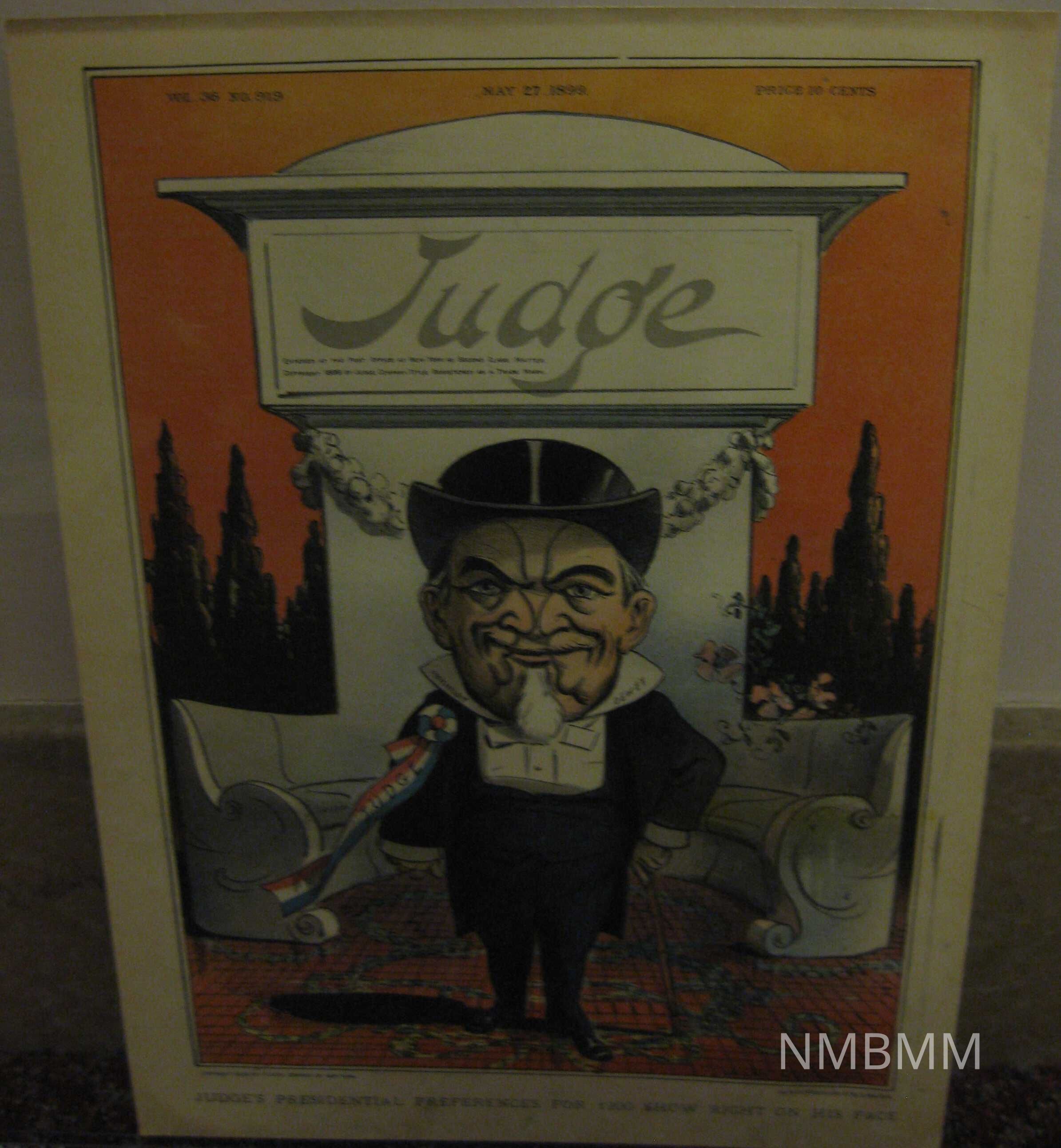 The item is a cover from the publication, Judge from May 27, 1899, Vol. 36, No. 919. It is a political cartoon by Grant Hamilton that depicts a man as half President McKinley and half Judge Dewey. He is dressed in a coat with tails and a top hat. On the backside, an array of cartoons is displayed and information about the publication. The item is in a plastic sleeve for protection.Collection