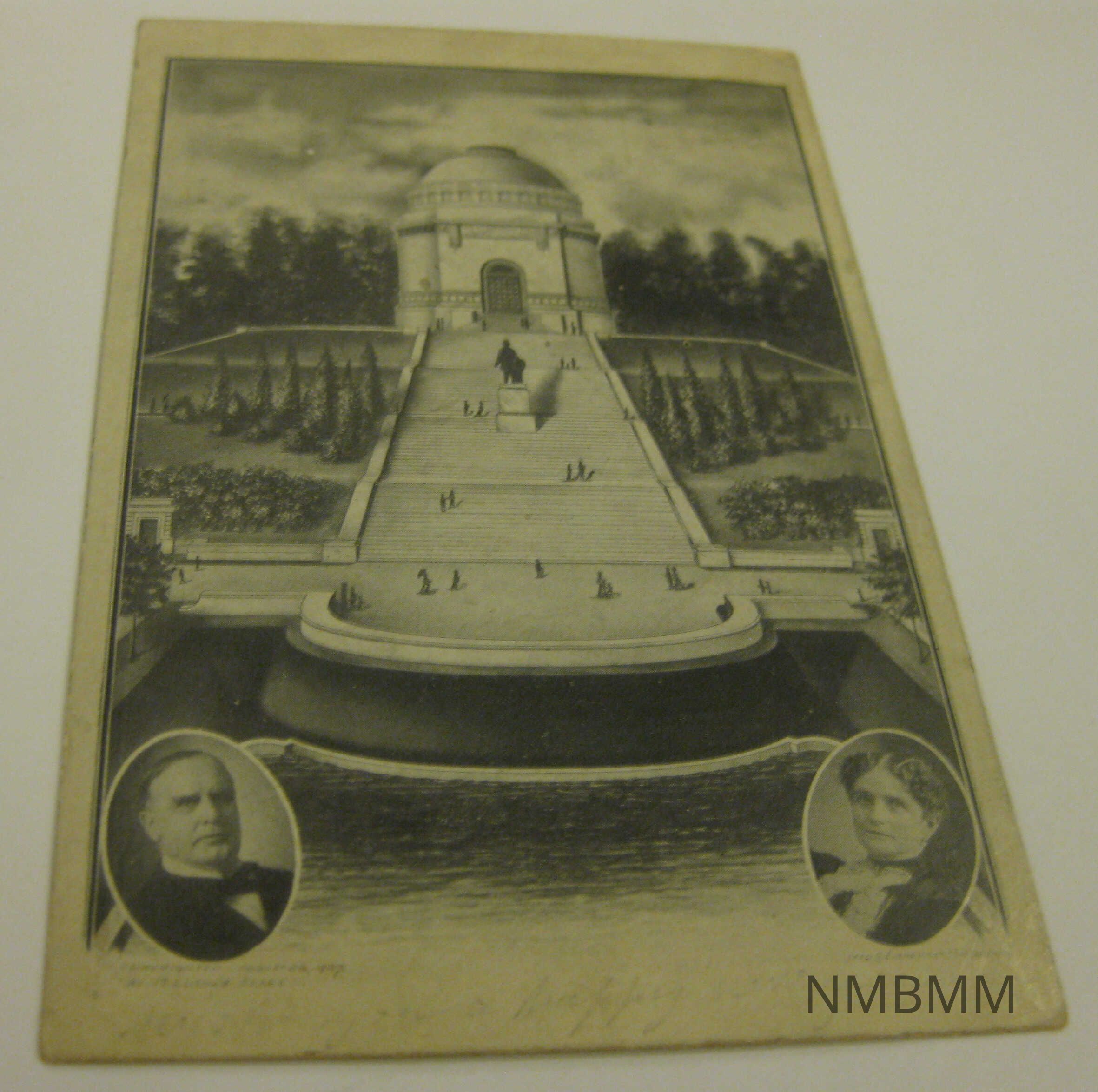 This item is a vertical black and white postcard with an image of the McKinley Monument Canton O. It is surrounded by trees and has people on the stairs and ground. Two oval images of President McKinley and Ida are at the bottom on the left and right. Copyrighted August 26,1907 M. Luther Keady. Thin border. In light and fading pencil, "Wishing you a happy new yeare" is written on the bottom. Split Back: one cent green Benjamin Franklin stamp, Addressed to Mrs. W. [last name not legible] Main St Alliance Ohio.