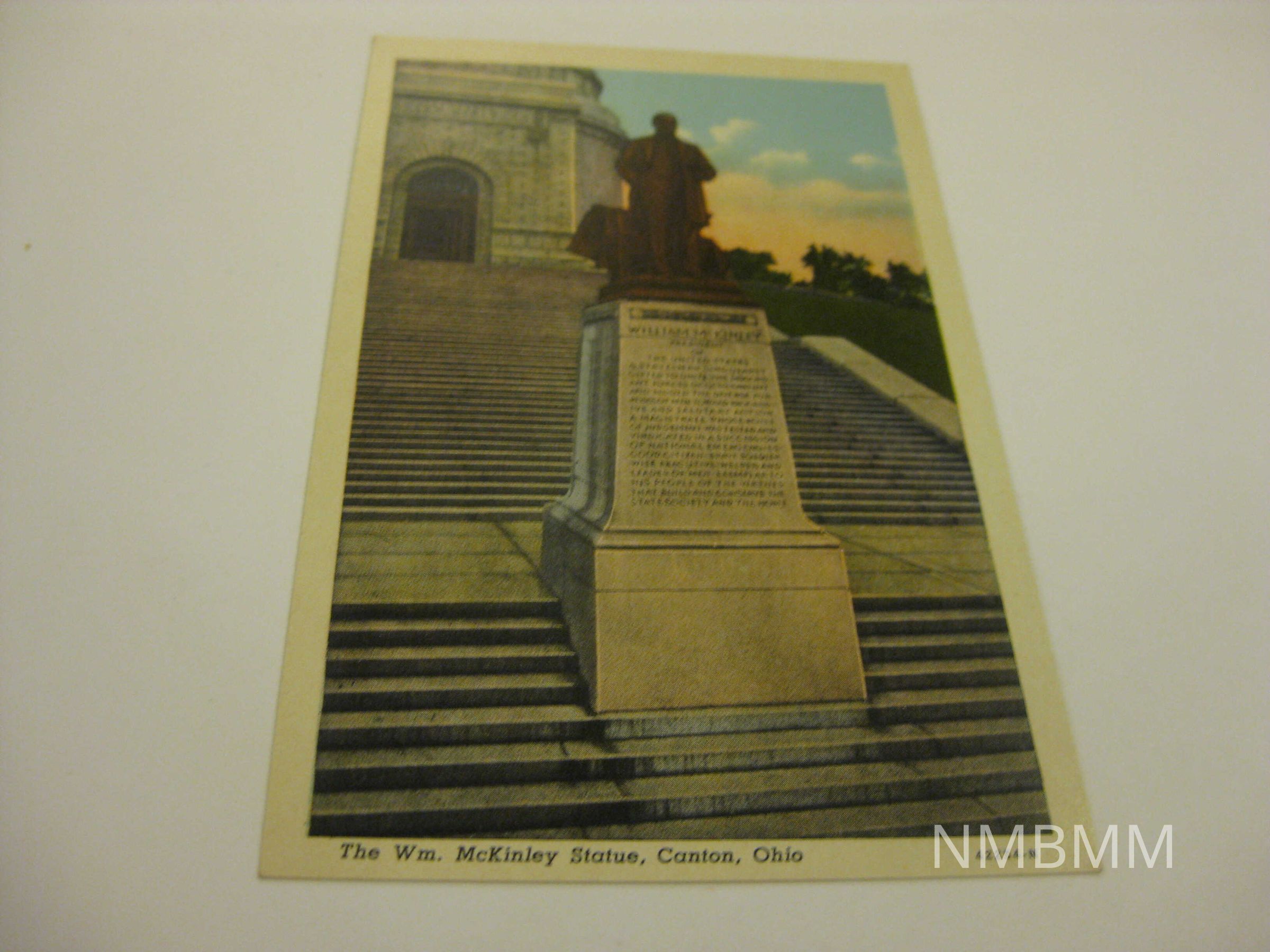 the Wm. McKinley Statue in Canton, Ohio. The memorial is in the background of the postcard. Split back: Distributed by Ralph Young, Canton, Ohio. Genuine Curteich-Chicago "C.T. American Art" Post Card (Reg. U.S. Pat. Off.)Collection