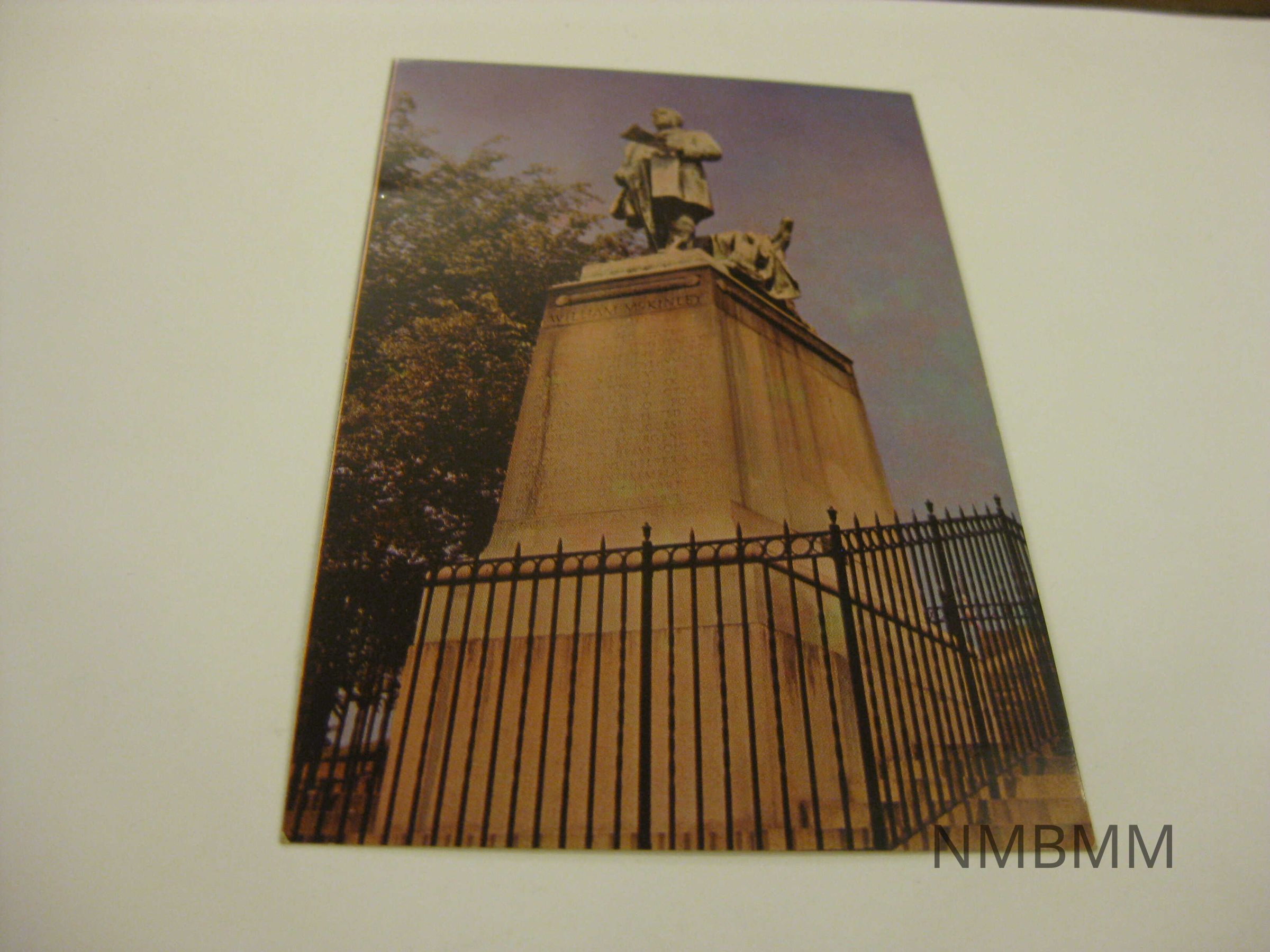 This item is a vertical color postcard with a photograph of the McKinley statue surrounded by an iron fence. Split Back: William McKinley Statue, Canton, Ohio, Executed by Charles Henry Niehaus and standing on the great stone-step approach to the McKinley Memorial, this statue represents President McKinley delivering his last address at Buffalo on the day of his assassination. The McKinley Memorial is administered by the Ohio Historical Society, Columbus. A Natural Color Reproduction by the Ohio Historical Society.Collection