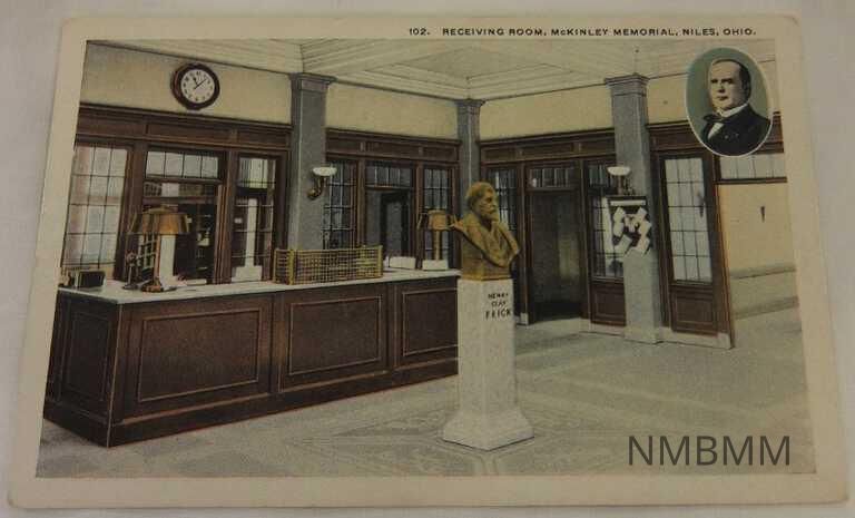This item is a postcard with a color image of the receiving room of the McKinley Memorial in Niles, Ohio. There is a portrait of McKinley in the upper right corner and a bust of Henry Clay Frick.