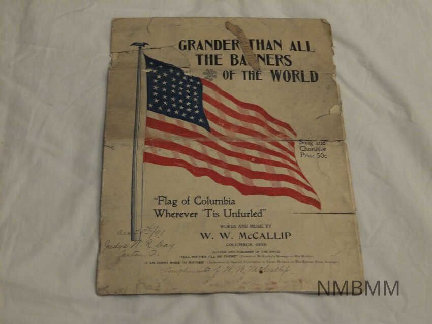 This item is a booklet containing sheet music for the song "Grander than all the Banners of the World." The front of the booklet contains a colored drawing of the U.S. flag, and the words, "'Flag of Columbia, Wherever 'Tis Unfurled', Words and Music by W.W. McCallip, Columbus, Ohio. Author and publisher of the songs: 'Tell Mother I'll be There' (President McKinley's message to his Mother), 'I am Going Home to Mother' ( Dedicated by Special Permission to Lieut. Hobson on his release from Santiago). Song and Chorus, Price 50c." On the bottom left corner, is handwriting which reads, "Dec. 25th/1898, Judge W.R. Day, Canton, Ohio." and "Compliments of W.W. McCallip"Collection
