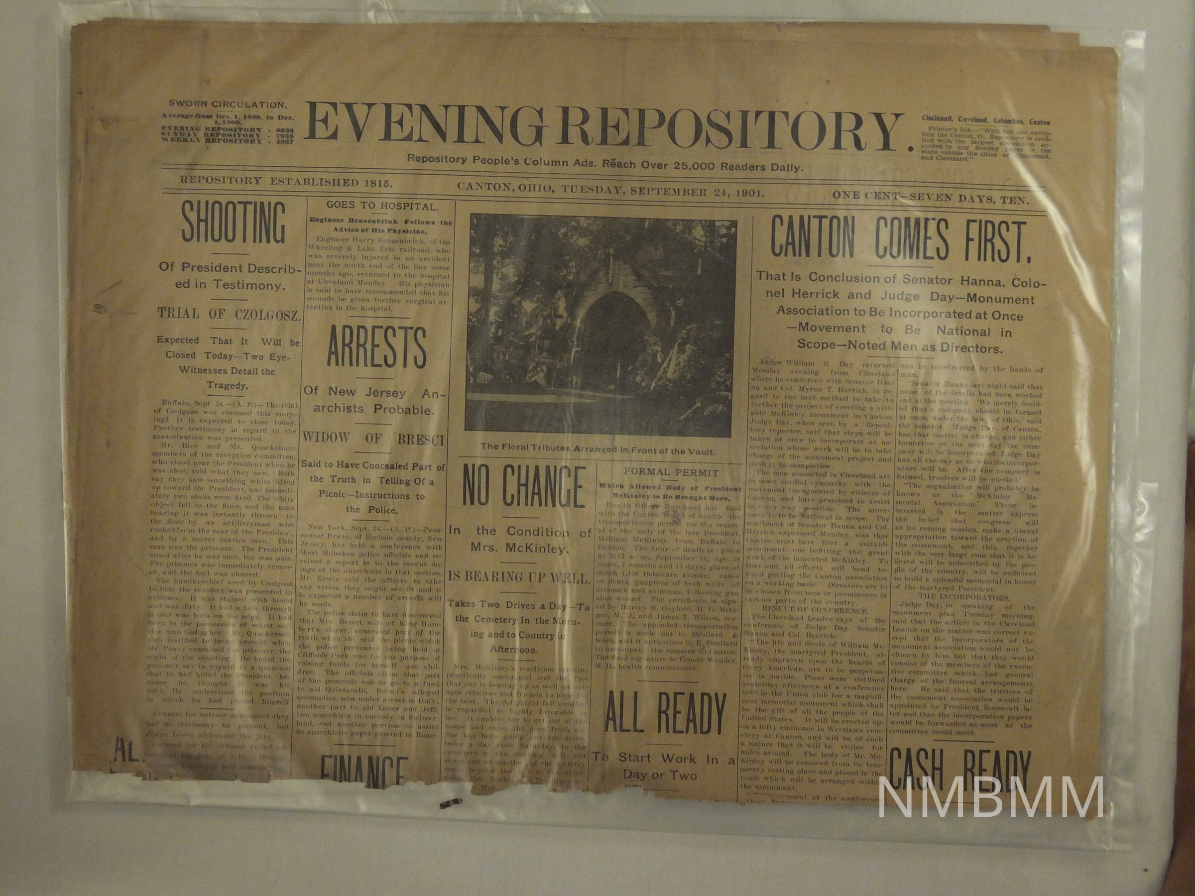 09/24/1901 Canton Evening Repository. Headline reads "Shooting." Articles about the court trial of assassin Leon Czolgosz for the assassination of President William McKinley; the condition of Mrs. McKinley; the McKinley Memorial Association; Westlawn Cemetery and the proposed McKinley Monument.Collection