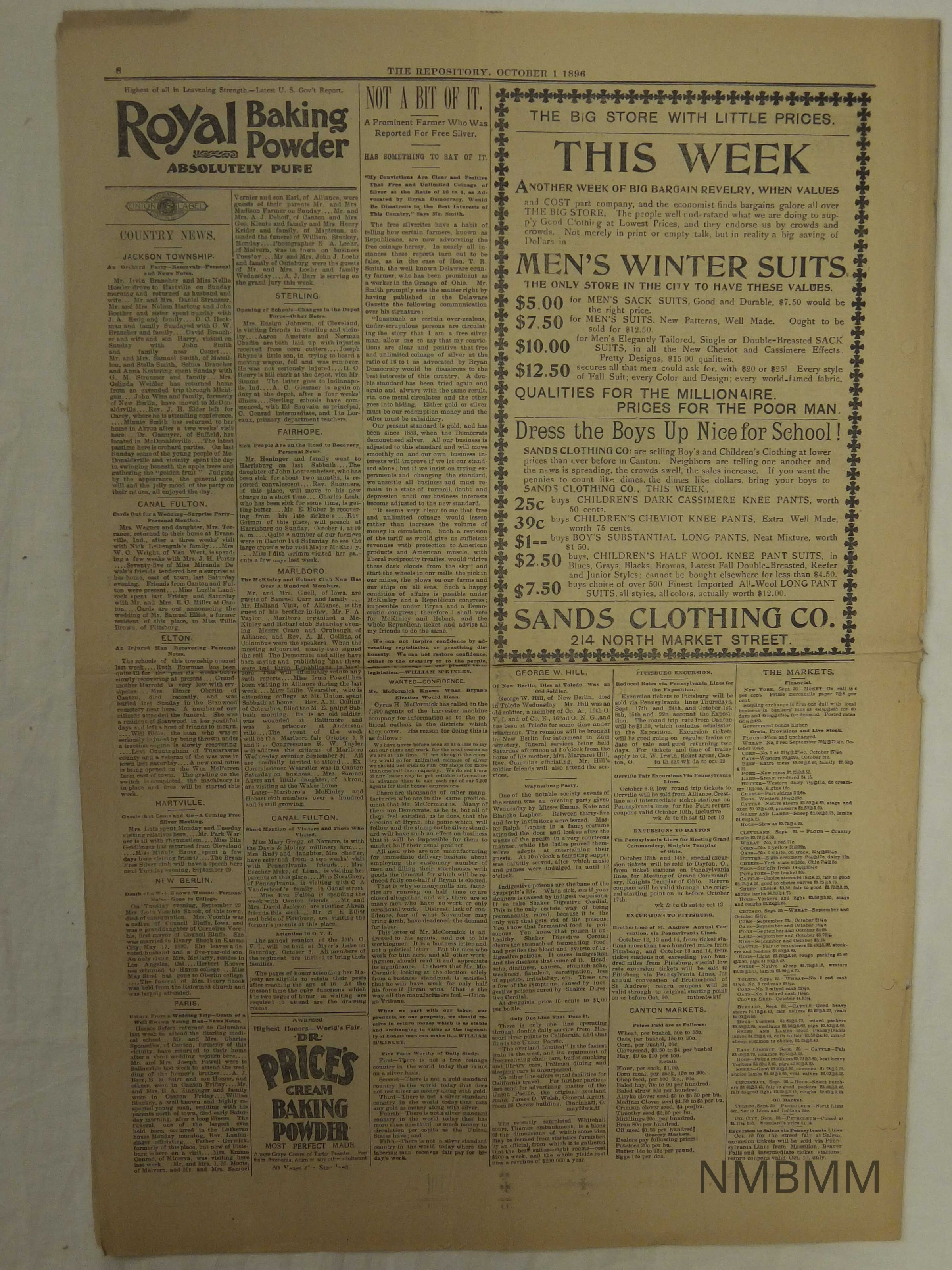 10/01/1896 Canton Repository. Headline reads "Work And Wages At Home." Articles about Major McKinley's response to the address of Mr. Gray.