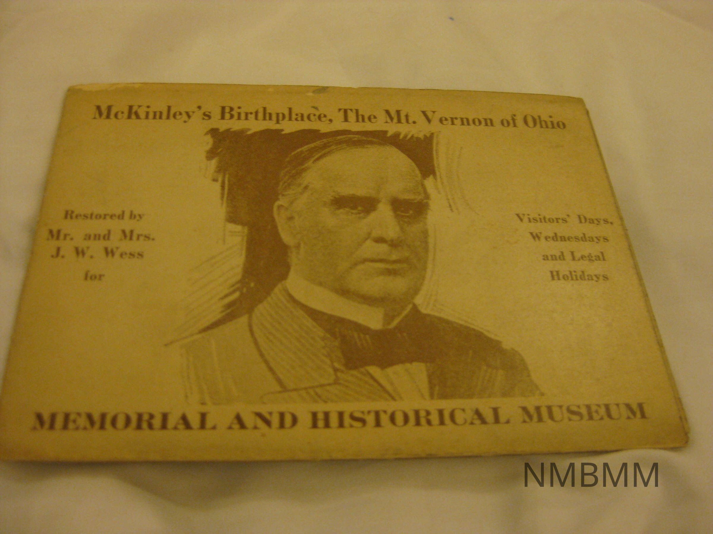This item is a pamphlet of postcards that shows different stages of the restoration of McKinley's home in Niles, Ohio. Title card reads " McKinley's Birthplace, The Mt. Vernon of Ohio, Memorial and Historical Museum, Restored by Mr. and Mrs. J.W. Wess." Brown and white in color. 5.5 by 4 inches.Collection