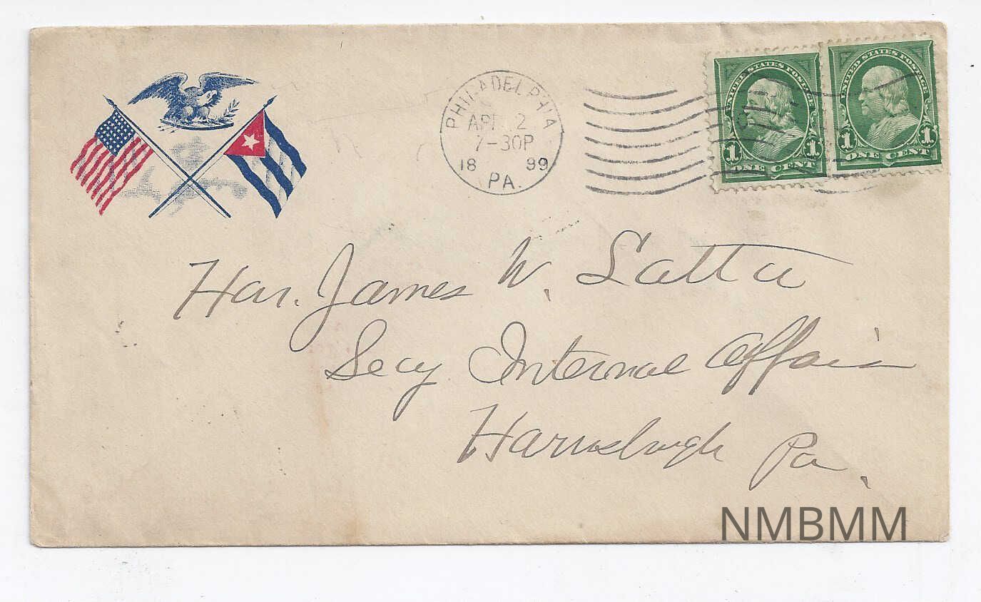 Envelope to Har. James W. Satter Secy. of International Affairs Harrisburgh, Pa. The front of the envelope has a United States flag crossing a Cuban flag under an American Eagle at the top left corner. The postmark and cancellation reads "Philadelphia, Apr 2 2-30PM 1899 PA" there are two green one cent stamps with the inage of Benjamin Franklin on each on the upper right corner of the envelope.Collection