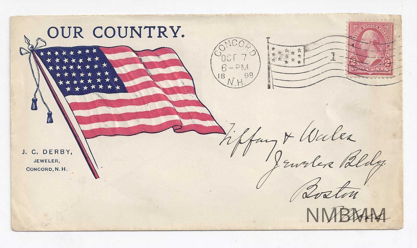 Envelope addressed to Tiffany & Wales Jeweler Building Boston, Mass. Postmark reads Concord Oct. 7 6-PM 1898 N.H. The cancellation is in the form of a United States flag. There is a red one cent stamp with an image of George Washington on the upper right corner of the envelope. The left side of the envelope features a United States flag with the address J.C. Derby Jeweler, Concord, N.H. in the margin. The words "Our Country" are printed over the flag. The back of the envelope has apartial postmark that reads "Boston, Mass 1898"Collection